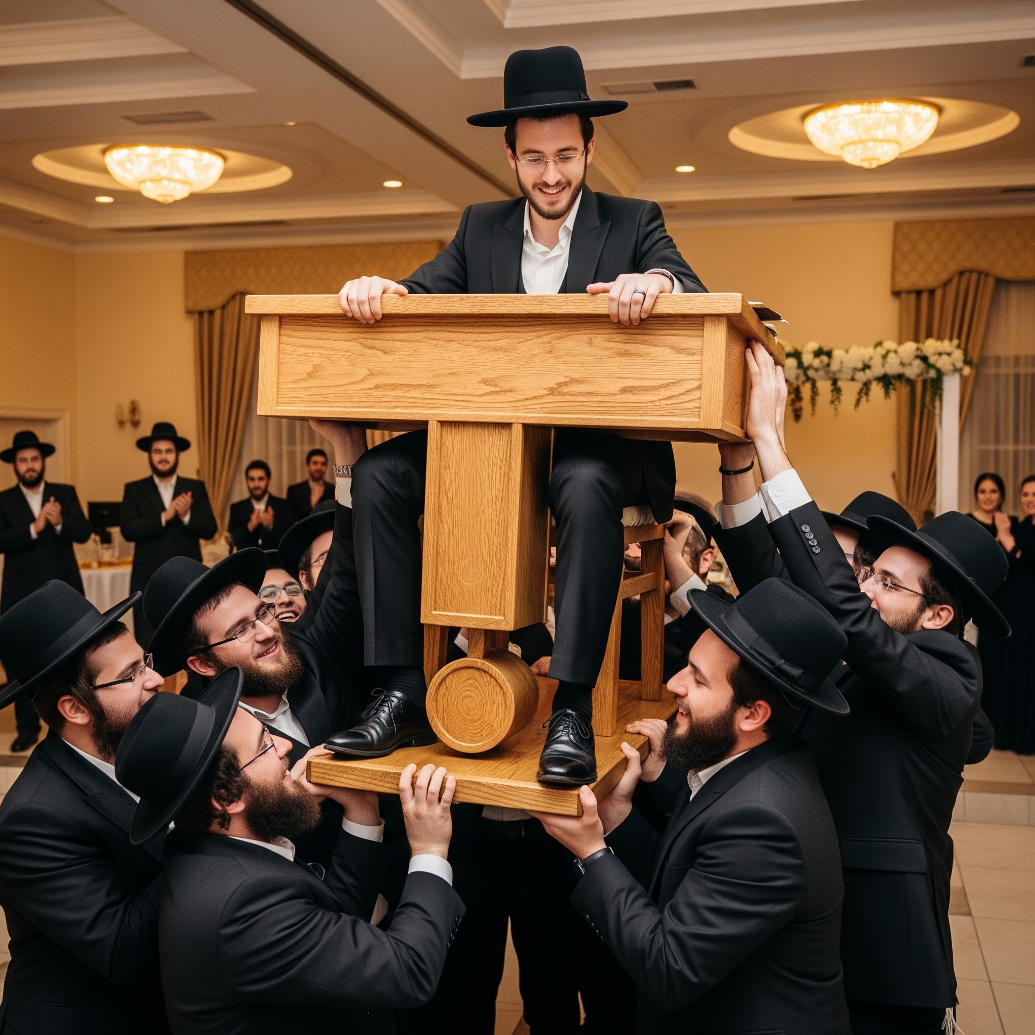 1. תמונה של חתן שמרימים אותו על שולחן שעשוי כמו הניקוד קמץ.