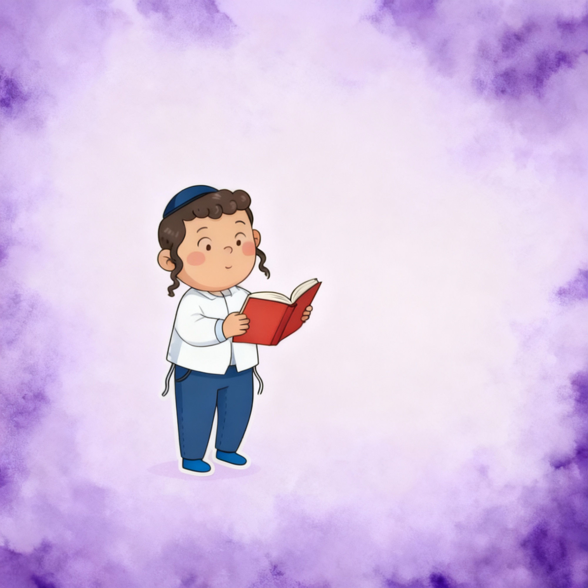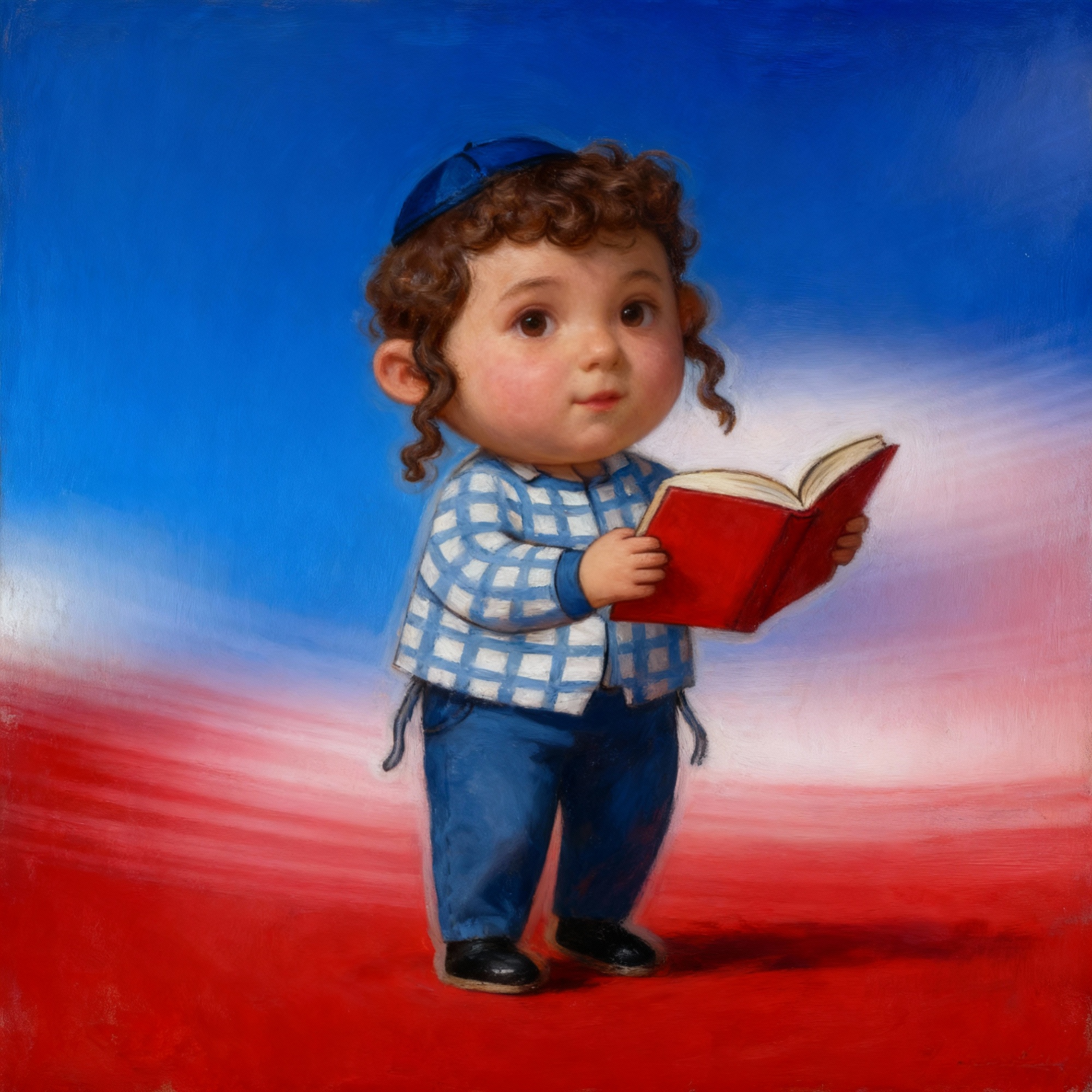 הילד עם השיער שלו קצוץ, אין לו בלורית, בתספורת של בנים צמודה לראש ורק מעל האוזנים נשאר פאות יהודיות בצידי הראש ליד האוזניים. , על הראש יש לו כיפה שחורה . הוא מחייך, ומחזיק בידיים ספר פתוח. כל הציור בסגנון ציור וקטור