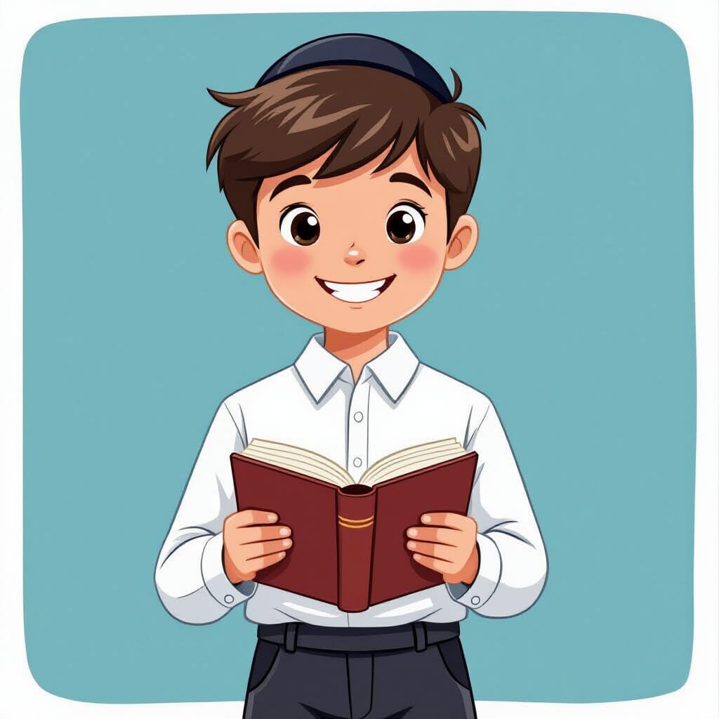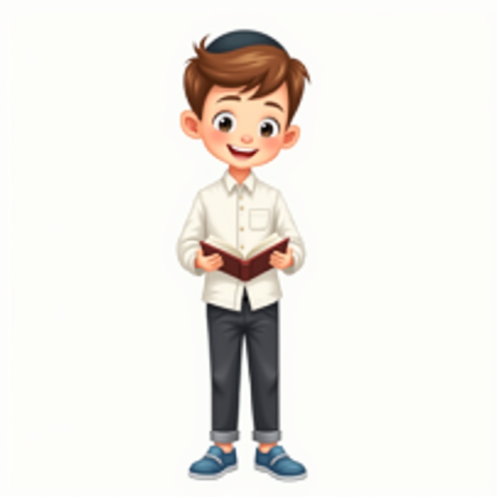 A 10-year-old boy is wearing a white buttoned-up shirt with a collar and long sleeves. The shirt is loose fitting, black tight-fitting pants. Children's blue shoes. He looks neat and clean. The boy has his hair cut short, he has no bangs, in a boys' haircut close to his head and only above his ears remains Jewish wigs on the sides of his head near his ears. , On his head he has a black kippah. He is smiling, and holds an open book in his hands. The whole drawing is in vector drawing style