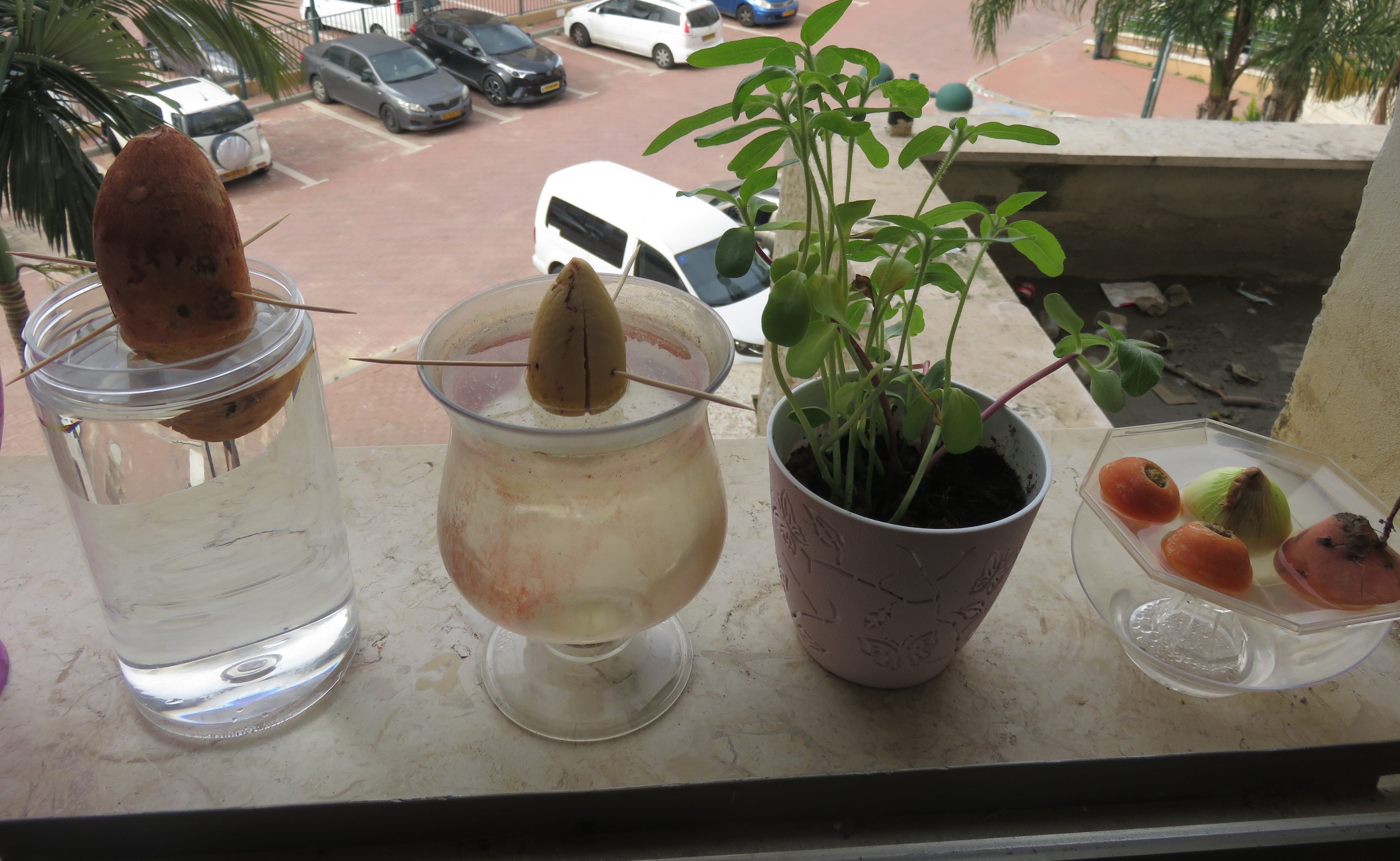 שתלתי בחלון המטבח אבוקדו, גזר, בצל ובטטה. (רק במים זה מה שצריך)