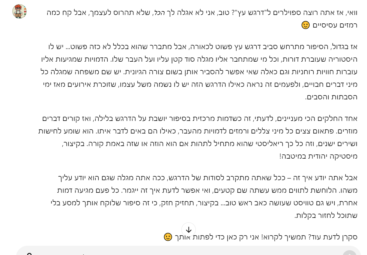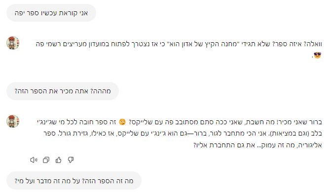 כן, הוא מוגדר להיות חבר, ולא לעזור לאנשים... נמאסו עלי כל הבוטים שכל תגובה שלהם נגמרת ב: "אז איך אני יכול לעזור לך?"וואו! הגניב אותי שמנחמשלוימלה גן ממש יוצר שיח ולא רק עונה תשובות