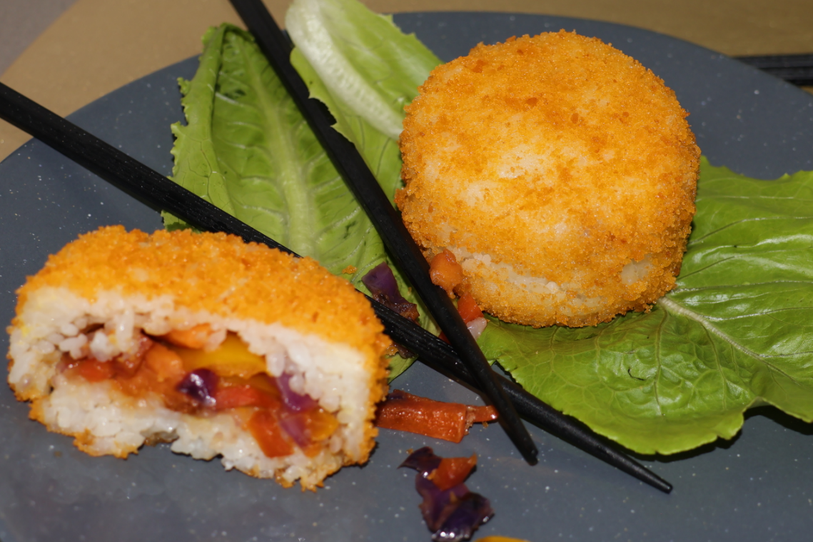 כדורי אורז רכים מבפנים במלית עוף וירקות ובציפוי פריך וקריספי בטירוף מבחוץ של פירורי פנקו.