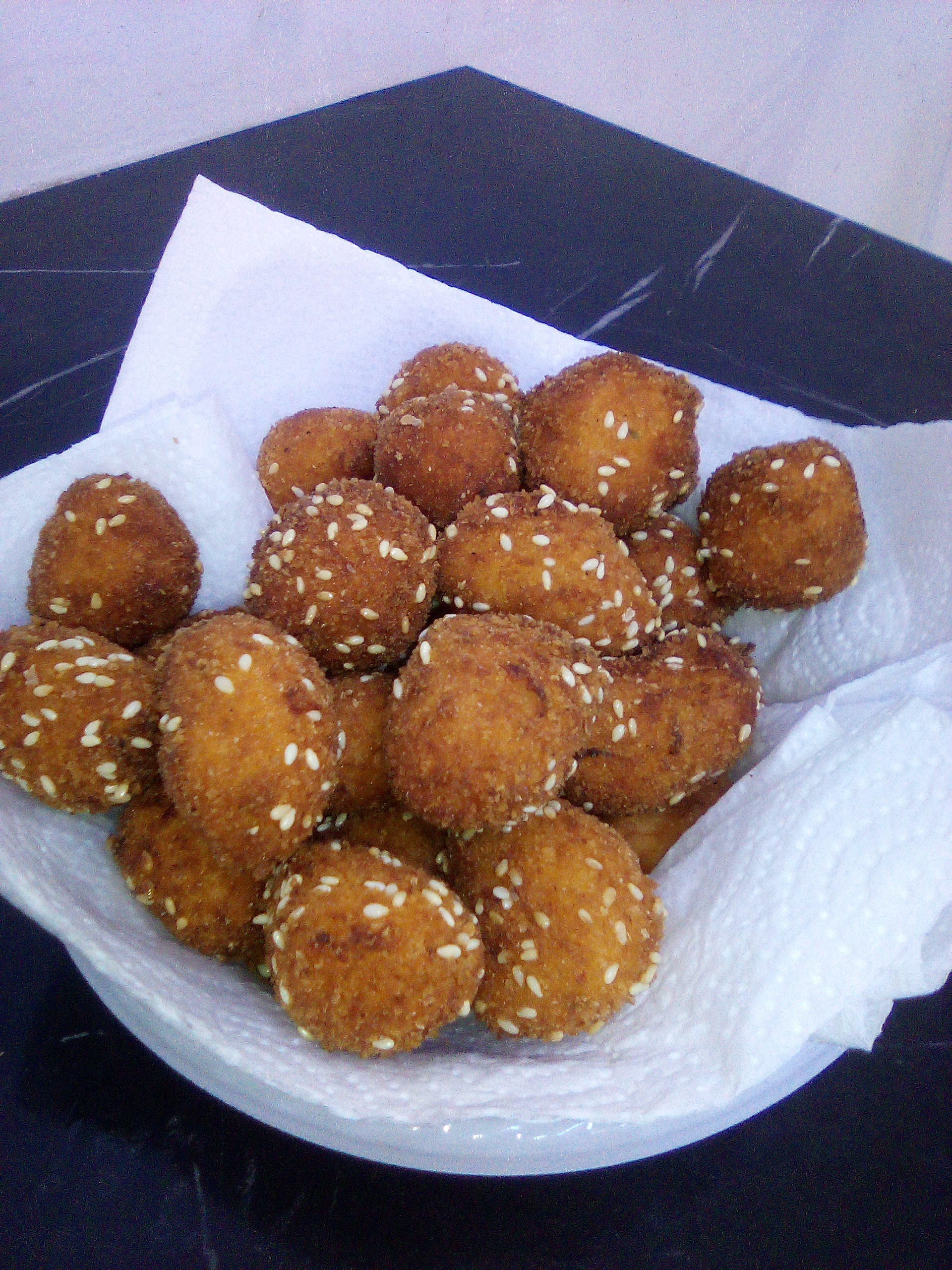 לערבב בצלוחית פ. לחם ושומשום. לצפות הכדורים ולטגן בשמן עמוק להזהבה טובה.