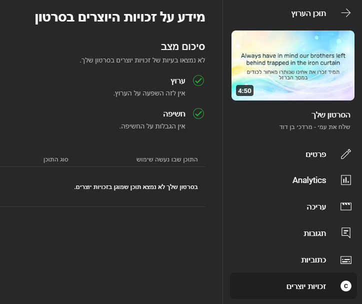 לכאורה זה לא חד משמעי גם אחרי שיוטיוב "זיהה" שאין הפרה של זכויות יוצרים עדיין יש סיכוי לקבל תביעה זה רק אינדיקציה ראשונית