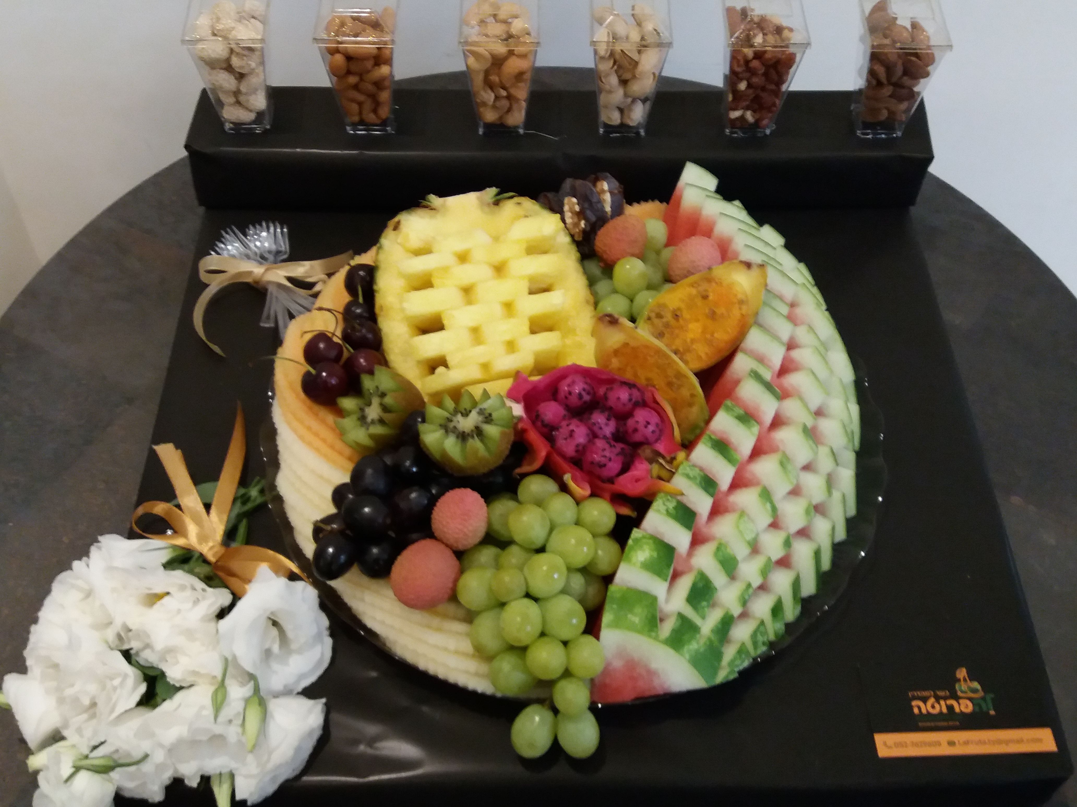 נראה לי עדיף בלי פרחים, כי פרות הם יצירה אדירה לכשעצמם ופרחים ג"כ, כך שניהם מאבדים את הבמה ובמיוחד שכבר שילבת פיצוחים בעיצוב עשיר, והם הכי משלימים לפירות, [אישית אני מסתייגת מפרות שנוגעים בפרחים]