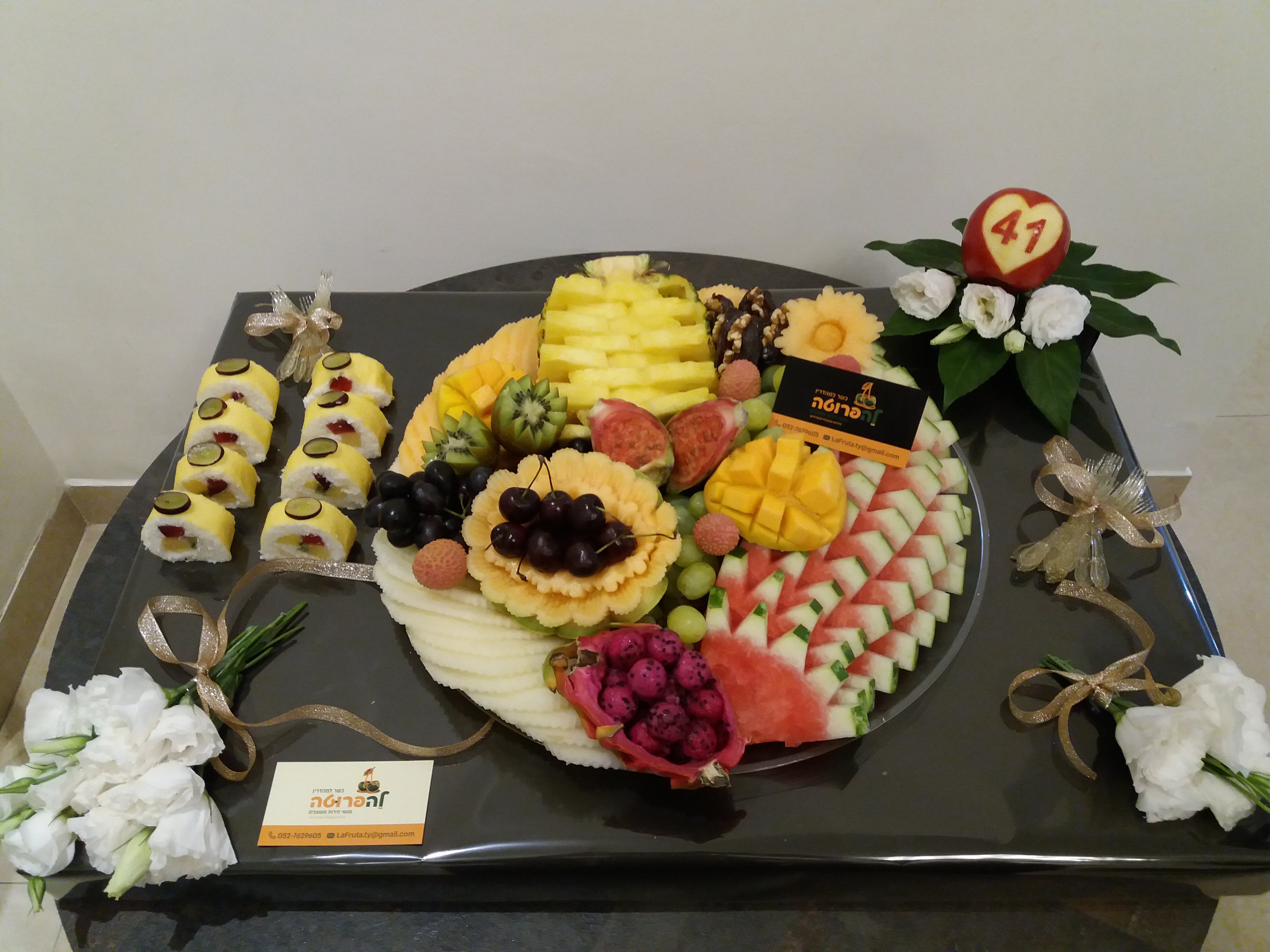 לדעתי עדיף בלי פרחים אולי אפשר לשים אותם במקום אחר, לא ליד הפירות. אפשר להשאיר את הפרח עם התפוח 41 הכי הרבה. נראה לי שמעלה את הערך של עיצוב הפירות כאשר הם בפני עצמם. לא צריכים תוספות או השלמות.