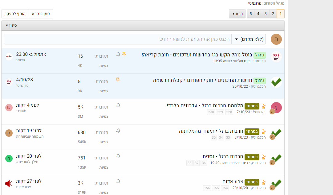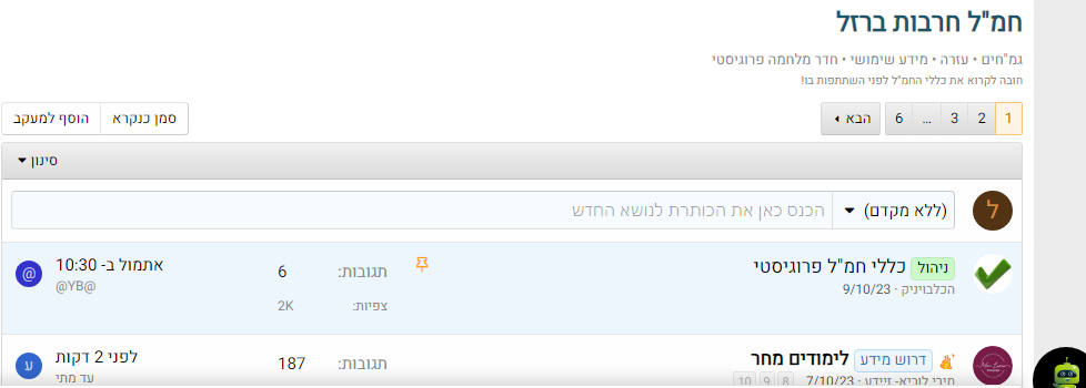 פתחנו פורום חדש "חמ"ל חרבות ברזל" בכדי לאגד את עשרות אלפי ההודעות הפזורות באתר, בקשות העזרה, הצעות סיוע, גמ"חים, מידע שימושי הקשור למלחמה. וכמובן, עם הפיקוח המחמיר והמיוחד של צוות פרוג!