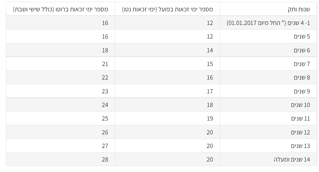 מספר ימי החופשה שצובר עובד במקומות עבודה שחל עליהם צו ההרחבה, בכל שנה קלנדרית לפי הוותק​