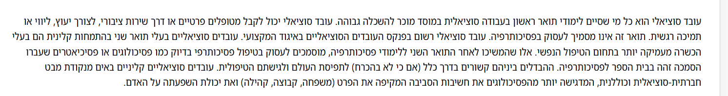 כידוע החוק די פרוץ בנושאי הטיפול. עו"ס עם תואר ראשון יכול לייעץ וגם לטפל, גם שלא במסגרת ובפיקוח צמוד, בשונה מפסיכולוג עם תואר ראשון.