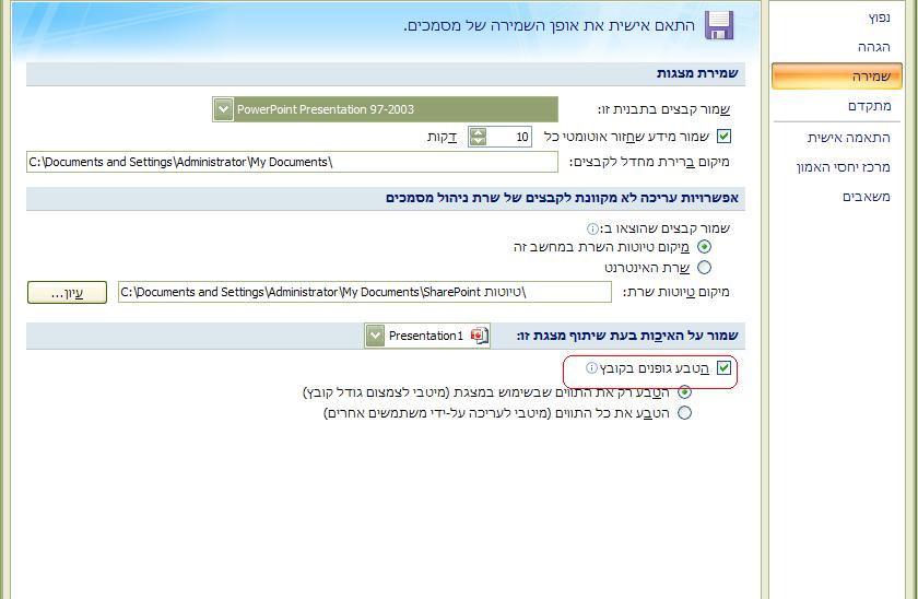 בתוך תיבת הדו-שיח של שמור בשם > כלים > אפשרויות שמירה. יש שם אופציה של הטמע גופנים בקובץ, וצריך לסמן שם V.