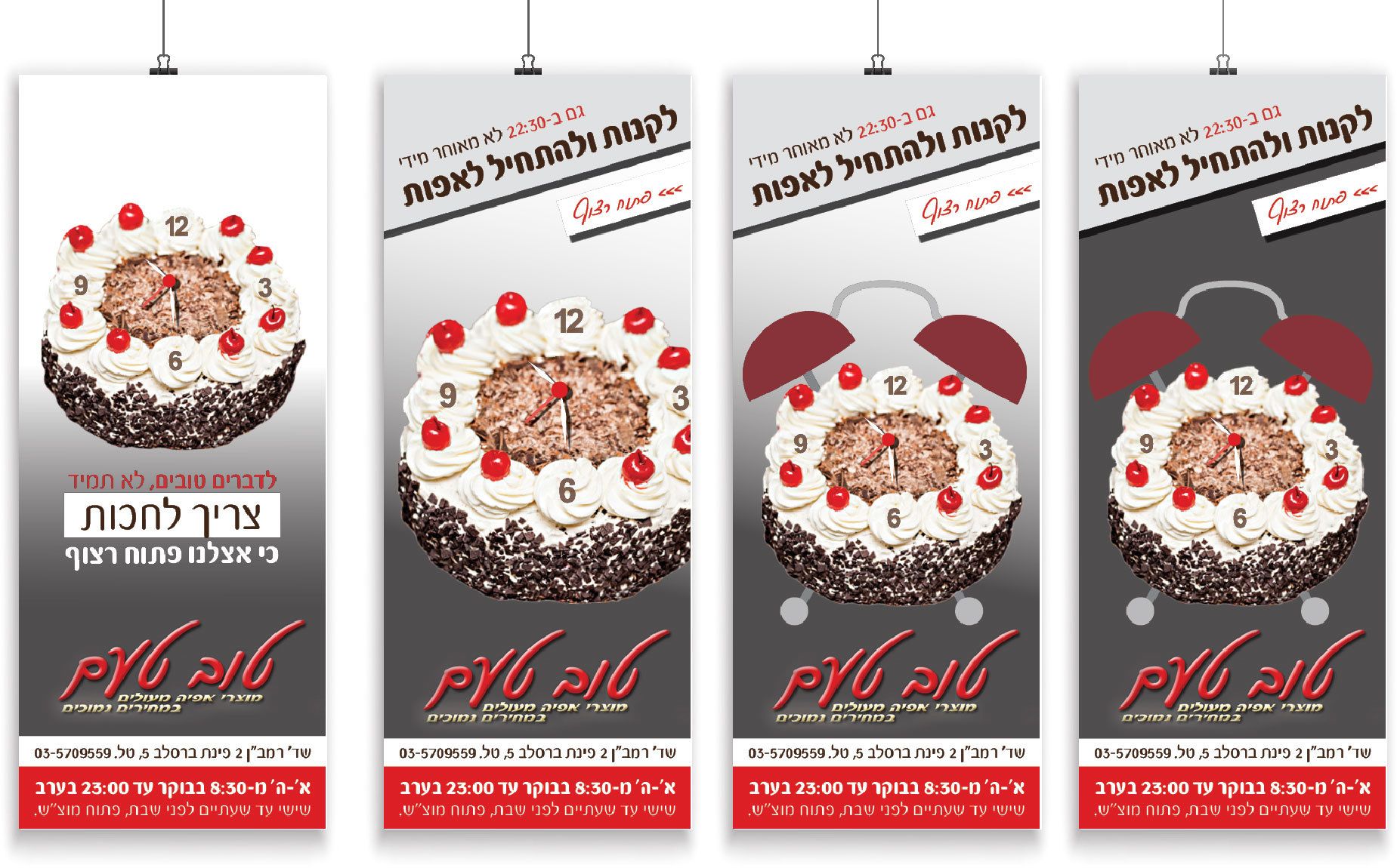 יפה! לדעתי, הרביעי יושב הכי טוב. במיוחד שהצורה של השעון מעורר, לא מספיק מקצועית. והכותרת העליונה לא נתפסת כ"כ לעין.