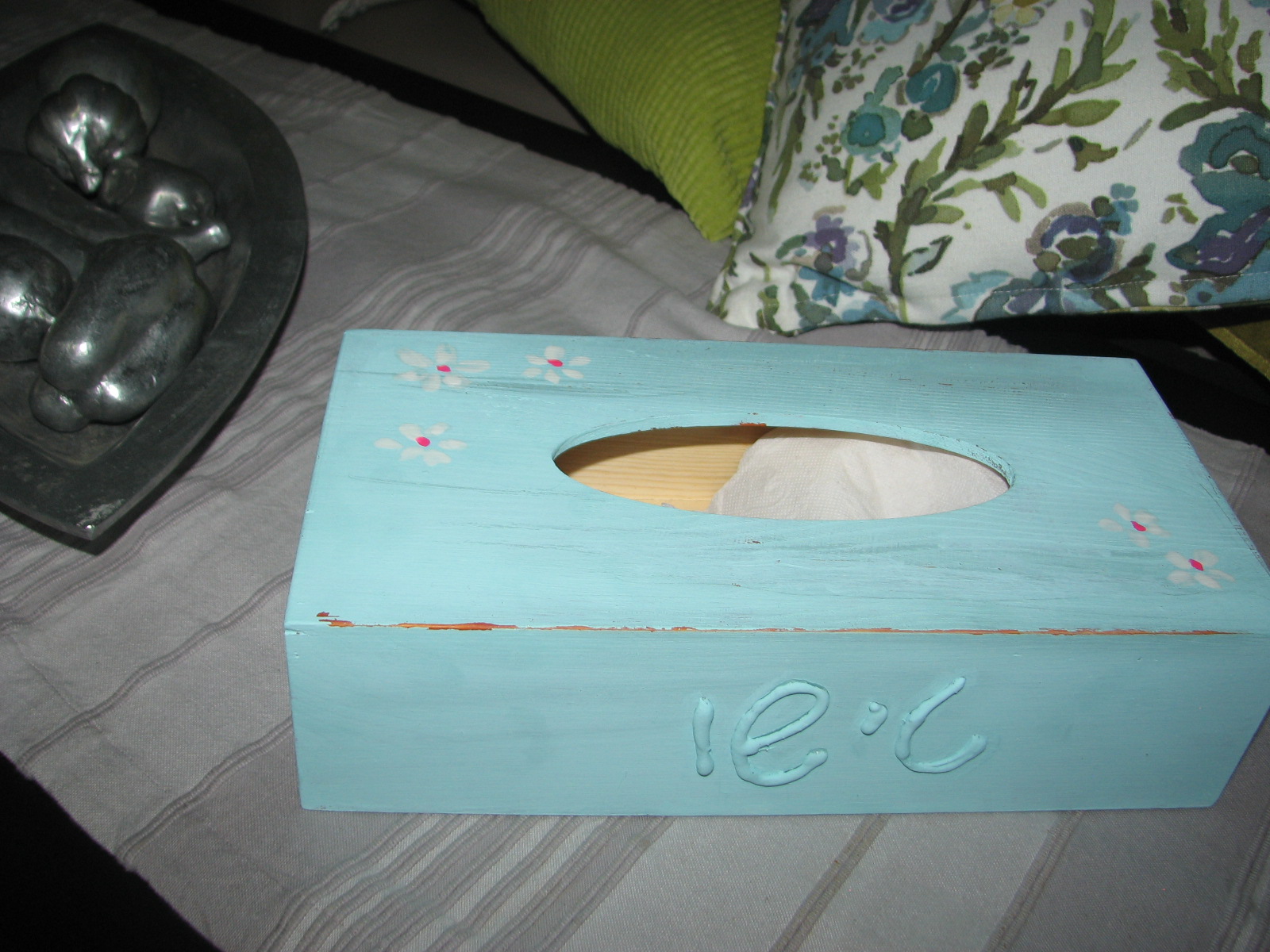 קופסא לטישו (מקסטוק-10 ש"ח). הכיתוב בדבק חם ומעל צבע אקרילי.