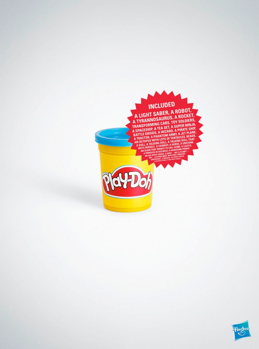 3. בר בצק שבתווית לידו כתוב "מכיל" ומתחת כל מיני דברים שניתן להכין ממנו כמו ספינת חלל, סט תה, רובוט וכדו'.