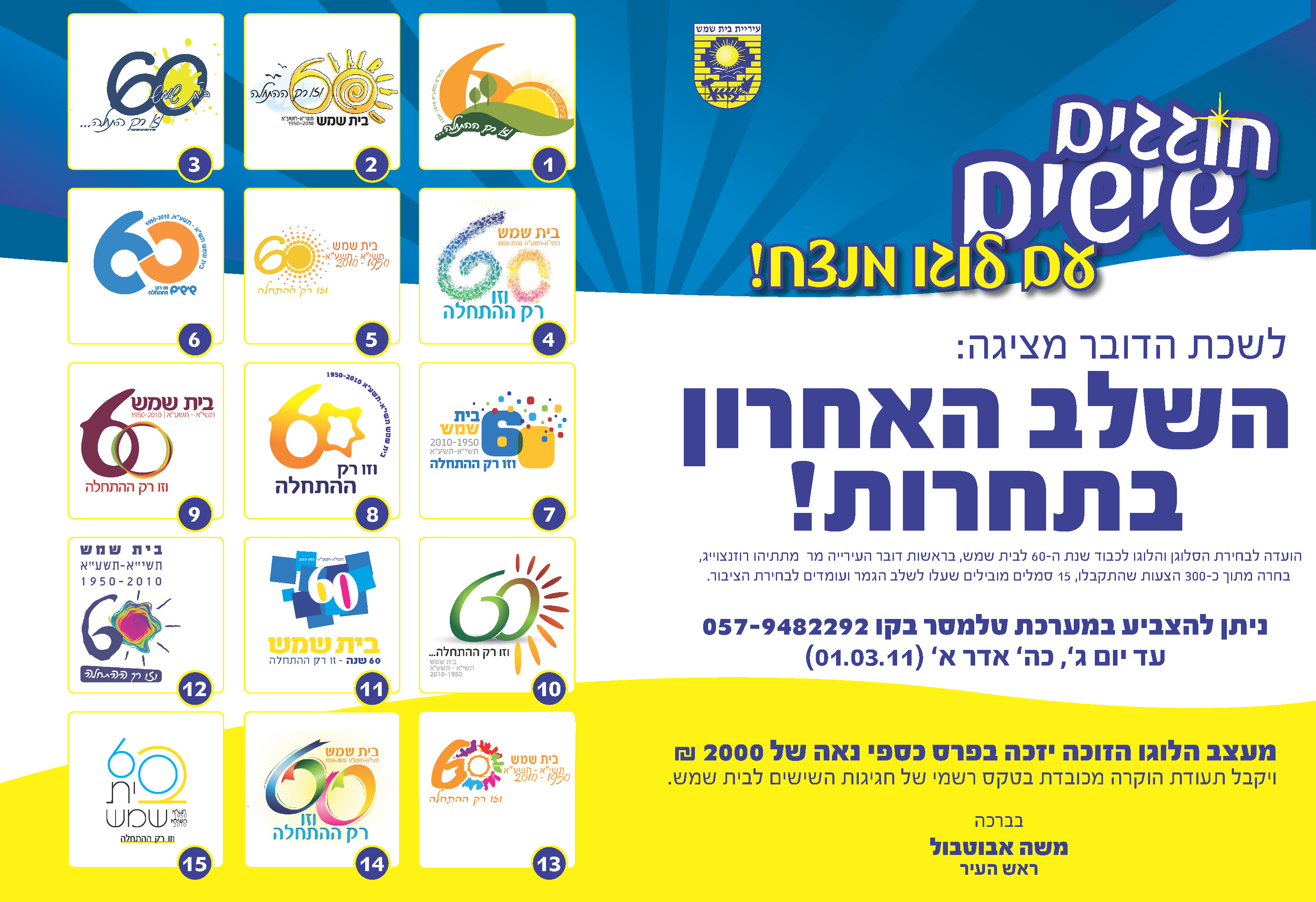 גם הלוגו שלי, דרך אגב, לא נבחר, וגם אני אישית הייתי חושב שהוא ראוי, אבל בהתחשב בכמות העצומה שנשלחה, מן הסתם ישבו מספיק על המדוכב כדי להכריע ולהעלות מס' לוגואים נרחב ככל האפשר שיביע את השישים ואת בית שמש בצורה הטובה ביותר.