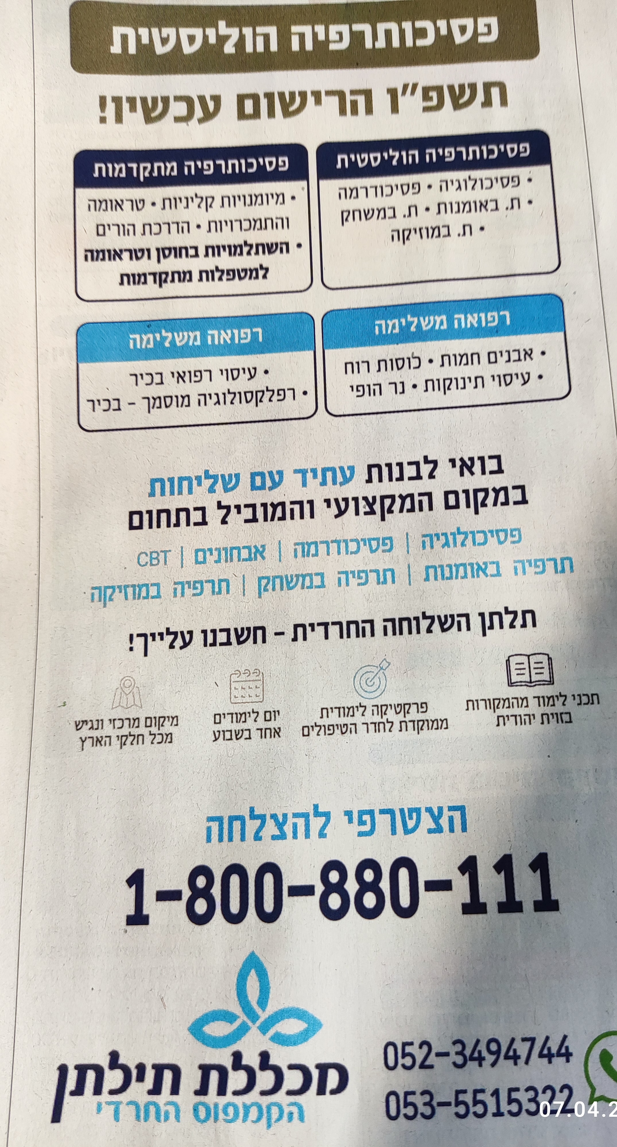 יש לימודי תעודה במכללת תילתן הקמפוס החרדי