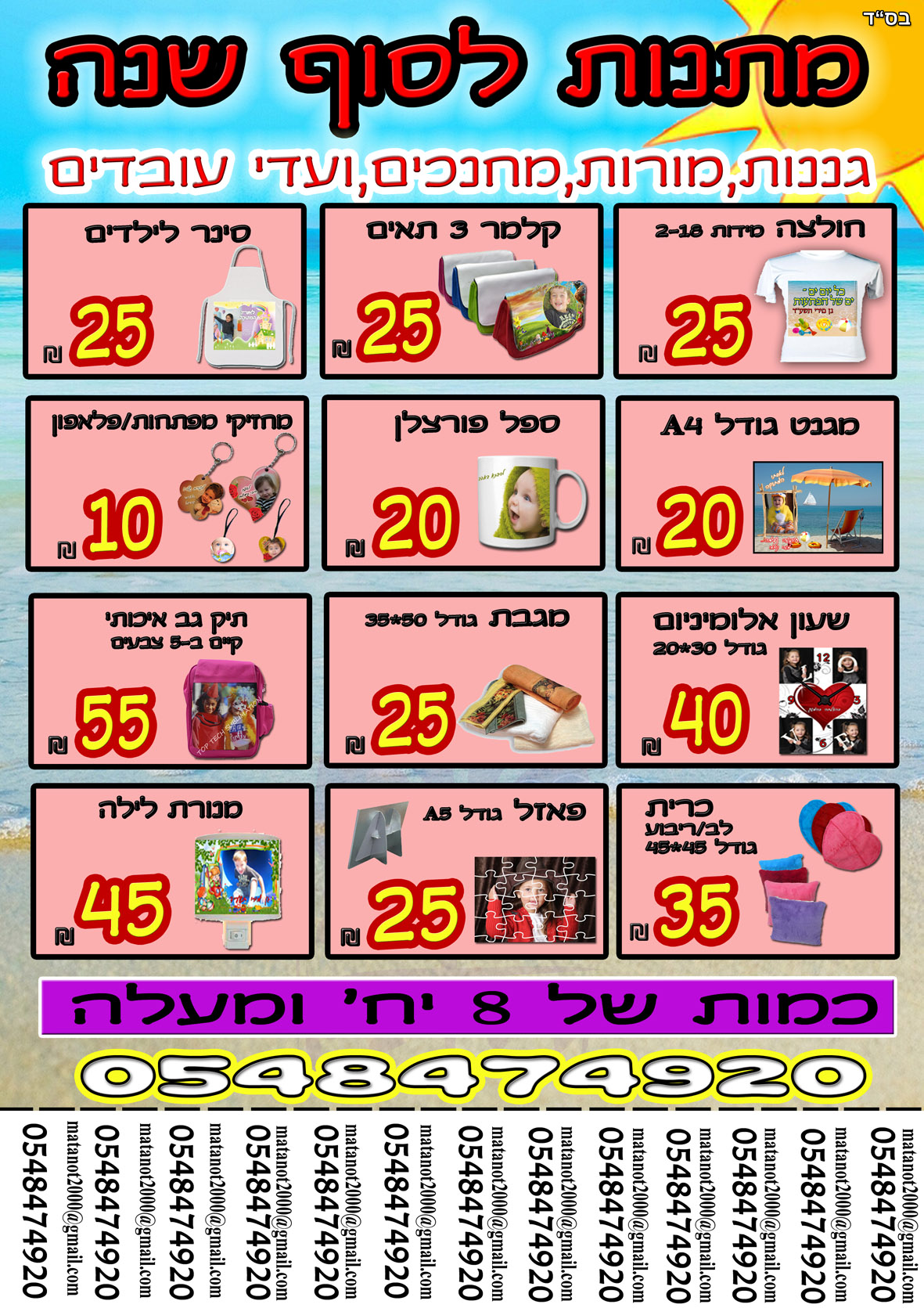 כל שנה אני מחפשת מתנות כאלה, ואף פעם לא ראיתי מחירים כל כך זולים! בכל פוטו, ספל זה 40 ש"ח לא כולל עיצוב, וכאן זה 20, כולל גרפיקה ואריזה!