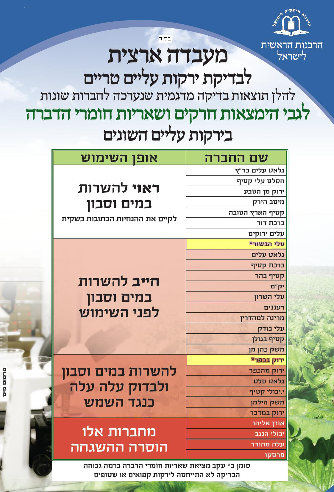 אבל פורסמה באלול האחרון [תש"ע] רשימה של תוצאות מעבדה שבדקה מהי הנקיות של ירק עלים על כל סוגיו. הבדיקות נעשו ע"י צוות שמונה מטעם ראש מחלקת כשרות ירקות עלים, שבראשותו של הרב שמואל אליהו שליט"א [בנו של הרה"ג המלוב"ן הרב מרדכי אליהו זצוקלל"ה].