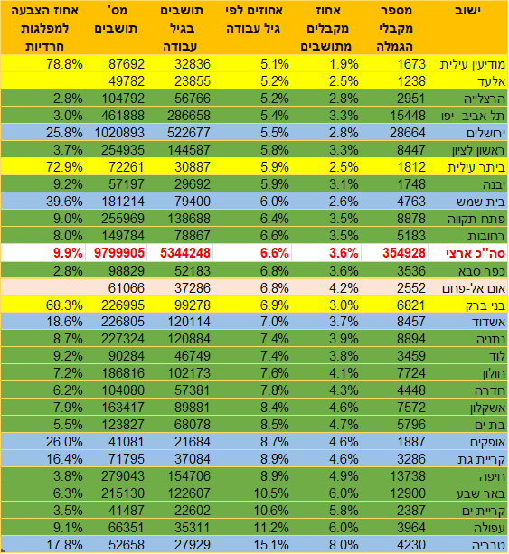 ראו קובץ מצורף עם הנתונים, ערים חרדיות מסומנות בצהוב, מעורבות בתכול, וחילוניות בירוק (מקור הנתונים, אתר ביטוח לאומי כאן)