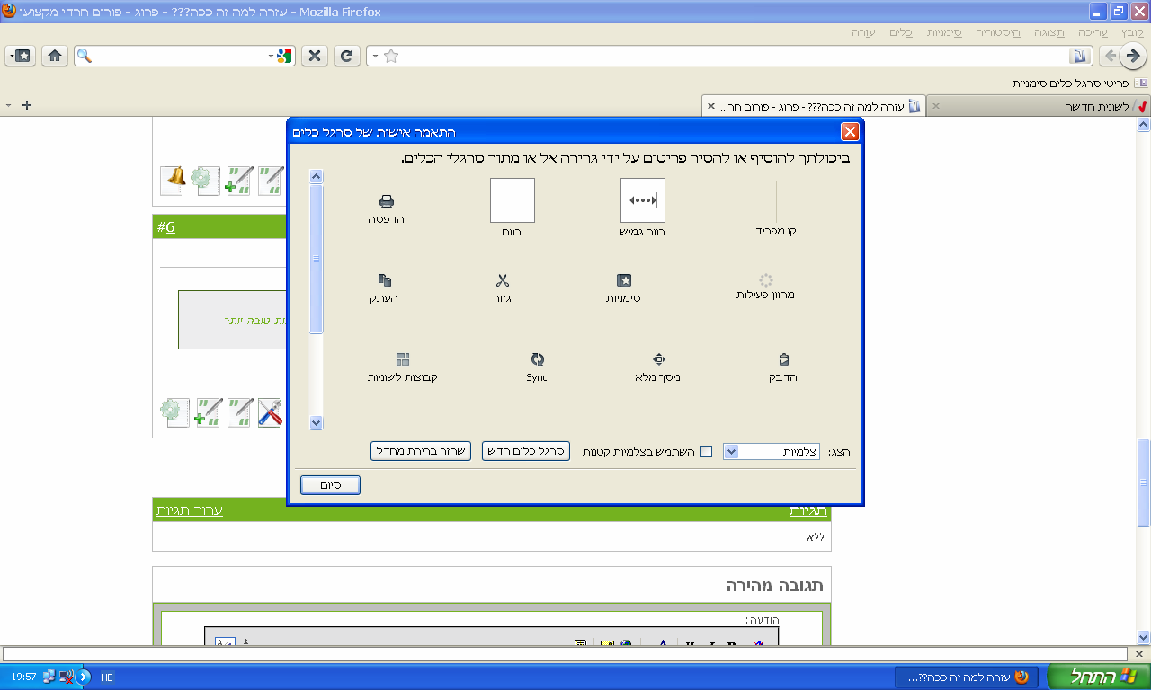 וחוצ'מזה למה החלון של התאמה אישית לסרגלי הכלים הכלים בצבע אפור כמו בתמונה שהעלתי קודם אצלך זה שונה??