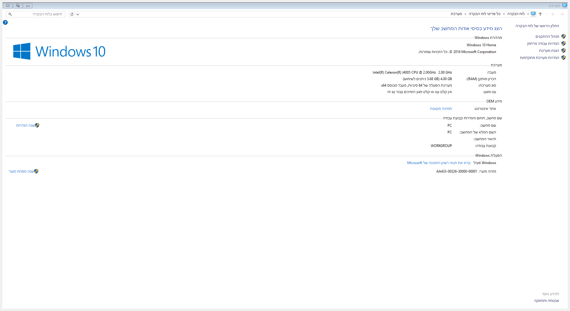 לחיצה ימנית על מחשב זה -מאפיינים (נראה לי ב7 זה שונה)