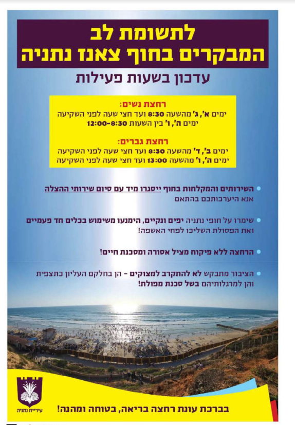 מידע שימושי למניעת עוגמת נפש, שימו לב: שינוי בזמני הרחצה בחוף צאנז נתניה