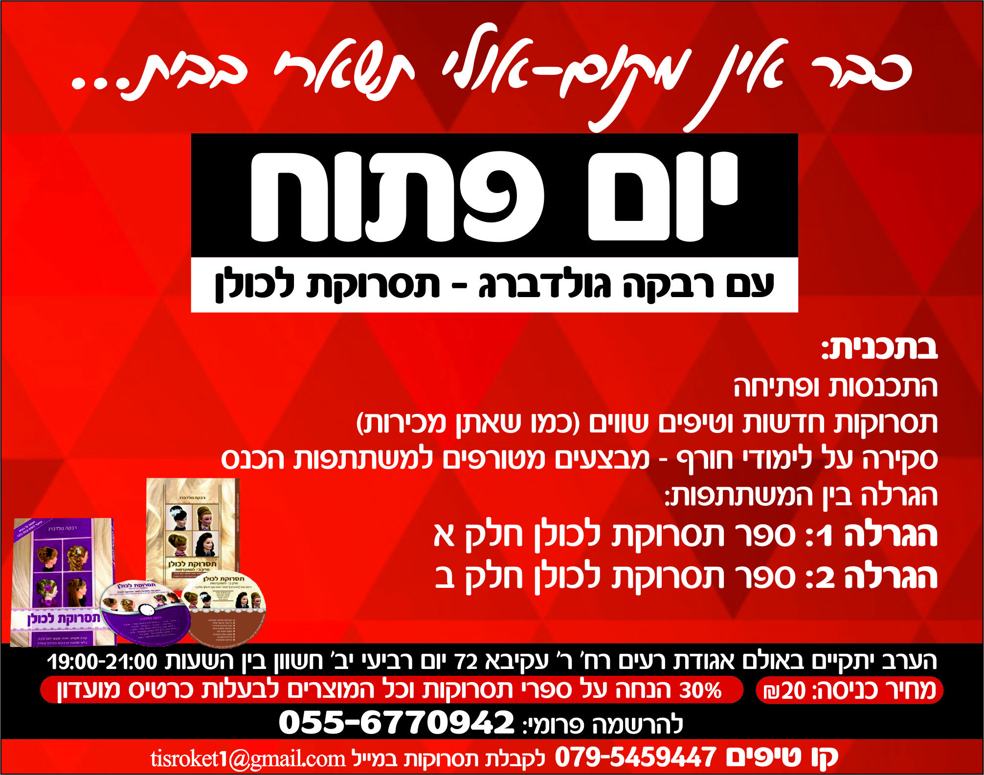 ומבצע נוסף: 30% הנחה על ספרי תסרוקות וכן על כל המוצרים לבעלות כרטיס מועדון