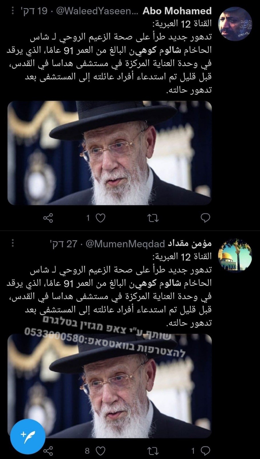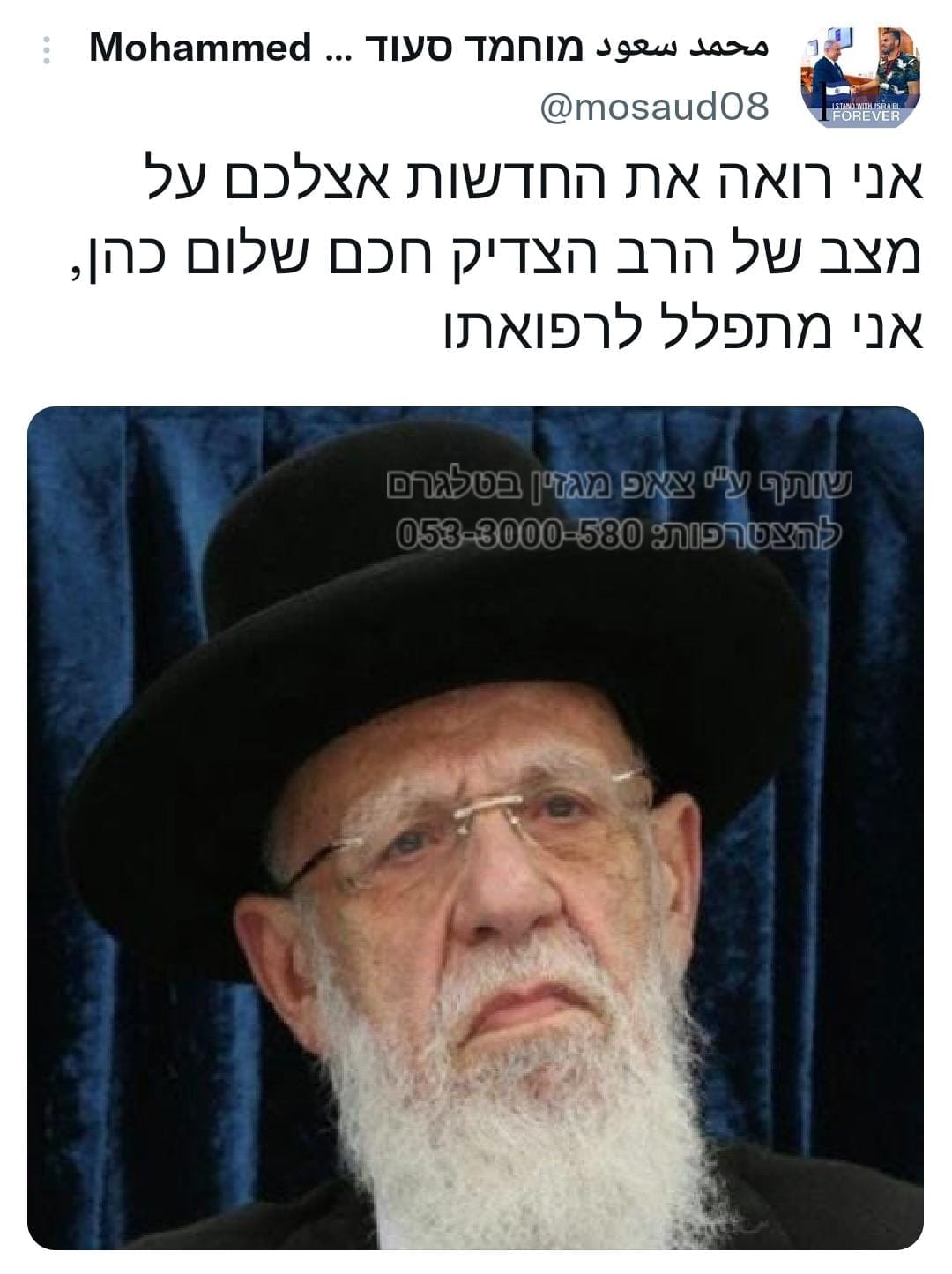 ‏גם אצל הפלסטינים מתעניינים באדיקות במצבו של חכם שלום כהן (שחר גליק) .