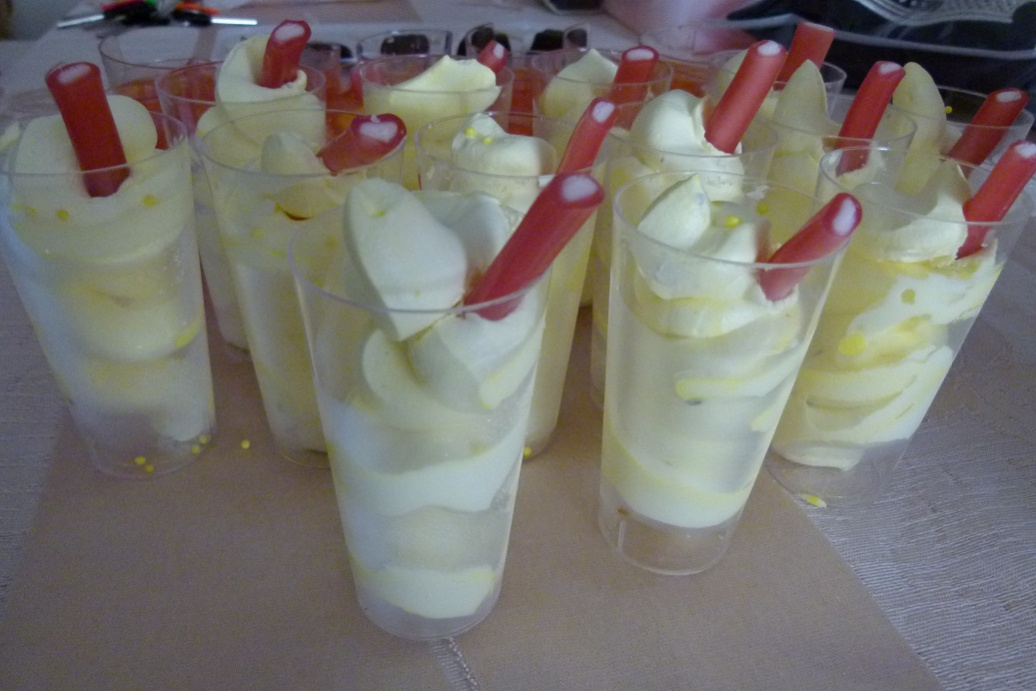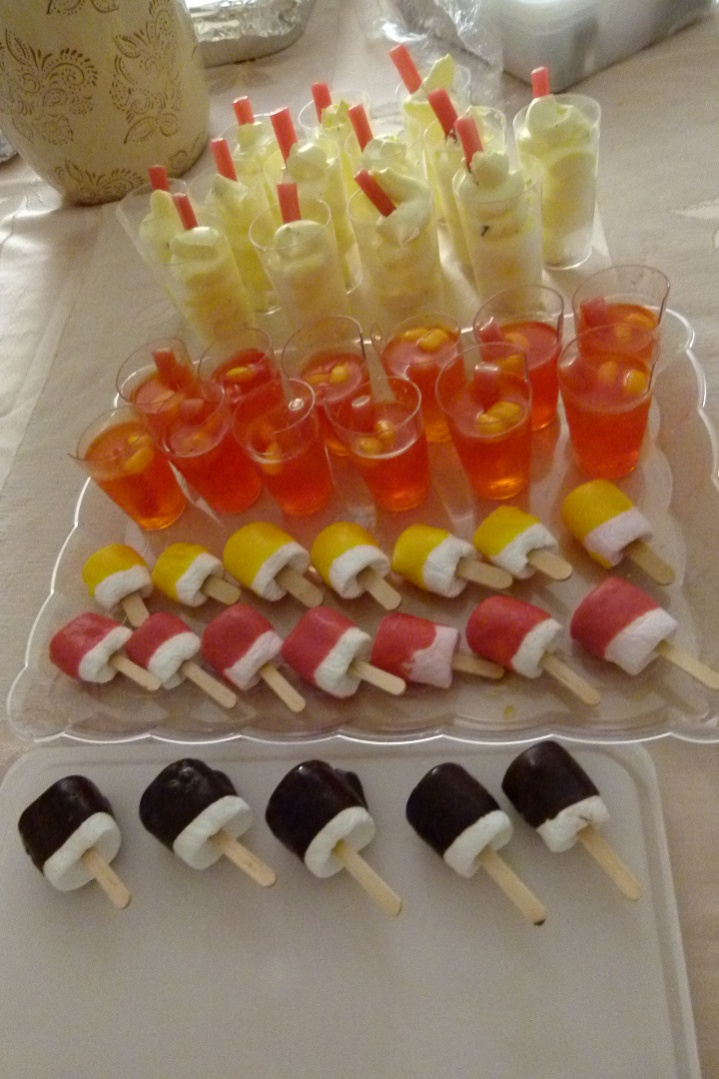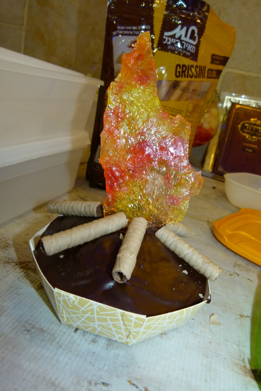 בבר מצווה שערכתי למישהי בל"ג בעומר הכנו ג'לים כאלו בכוסיות על רגל. על בסיס הכוסית הנחנו מקלות גריסיני חצויים שהיו טבולים בקצוות בשוקולד והם היו "עצי המדורה". יצא מהמם.