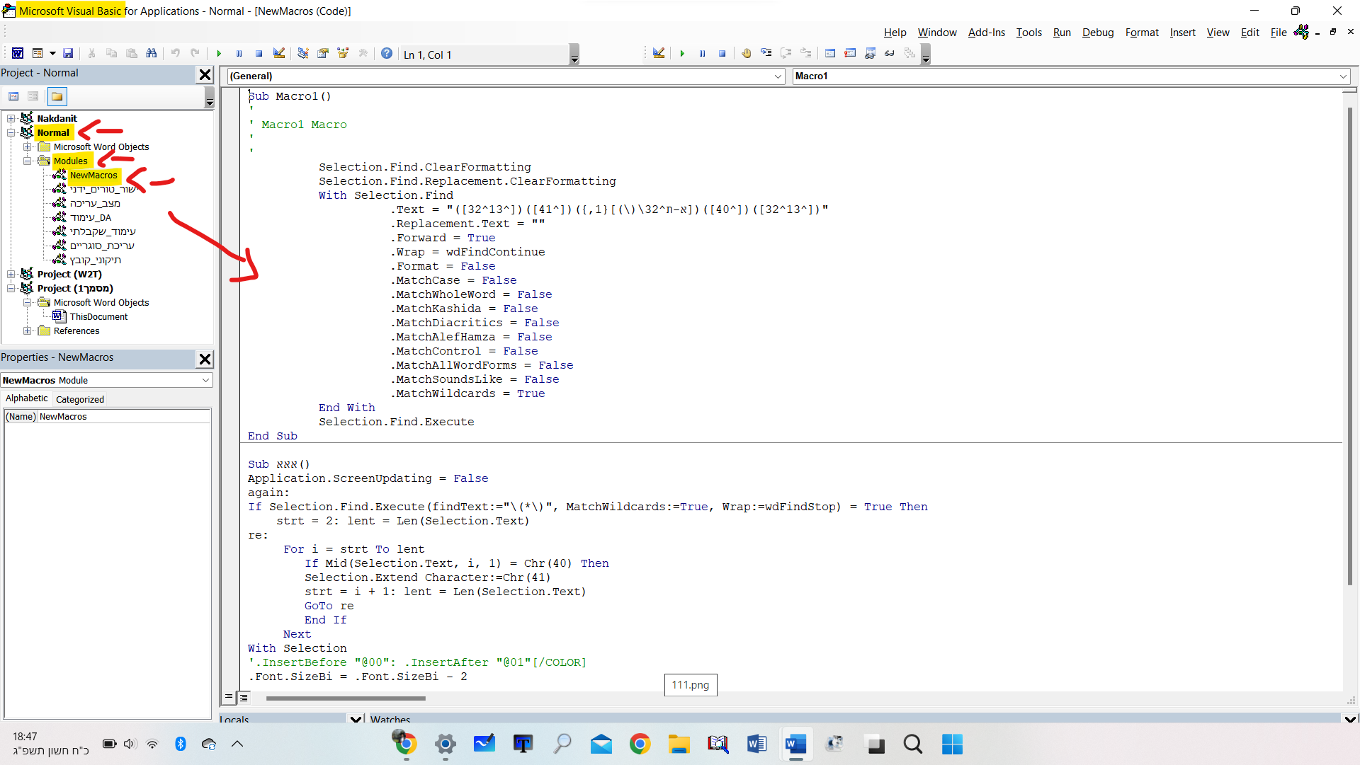 (כשהוורד פתוח תלחץ על F11+Alt, תיכנס לסביבת הויזאול בייסיק, בצד שמאל אתה תראה רשימה של טפסים - אחד מהם הוא Normal, תלחץ עליו יפתחו כמה תיקיות תלחץ על תקיית Modules ולאחמ"כ על NewMacros ומיד יופיע מצד ימין רשימה של כל המאקרויים תעתיק את כל המאקרו המדובר).