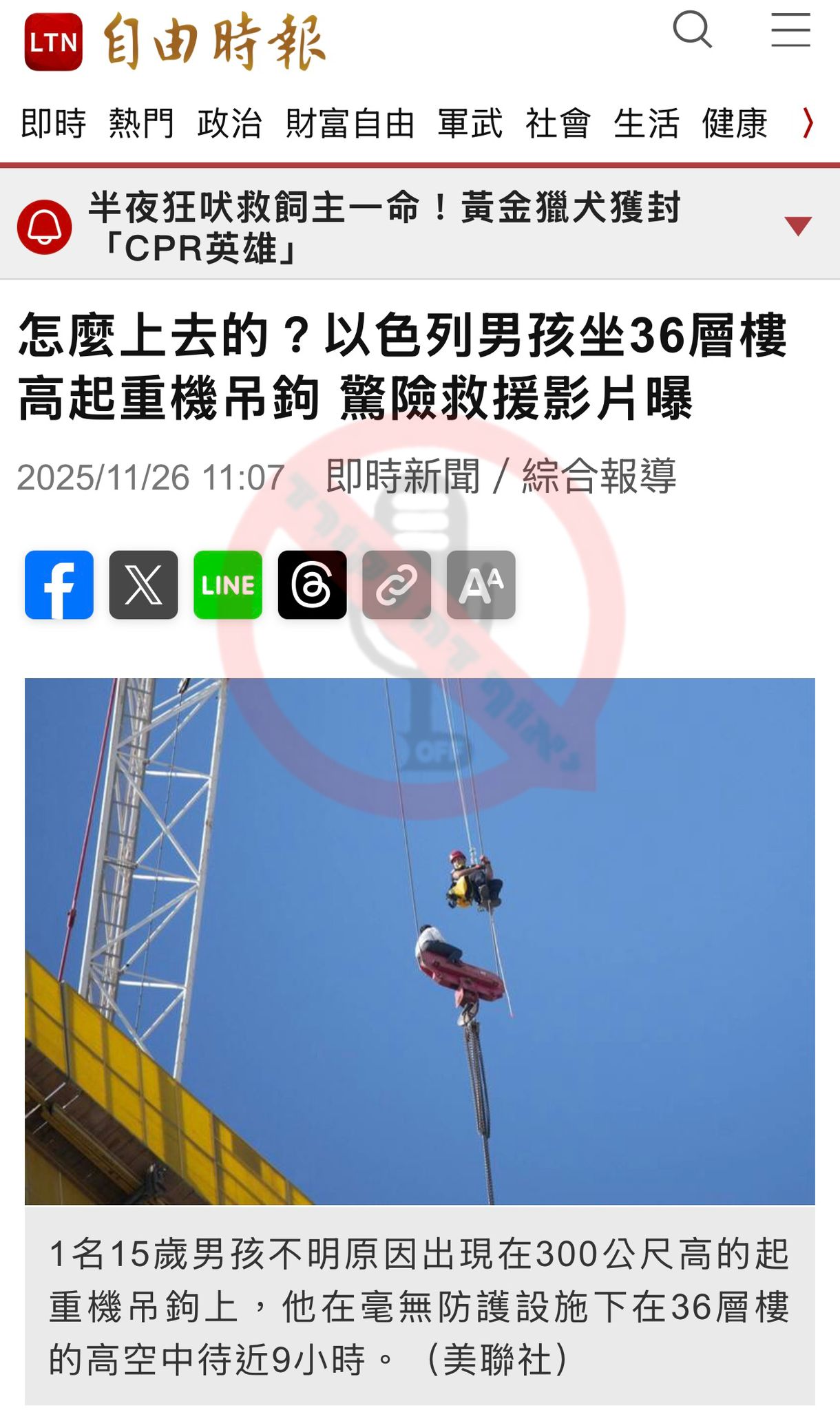 הפך למפורסם: אתר חדשות בסין מדווח על הנער החרדי שנתקע על העגורן בגובה 36 קומות בירושלים.