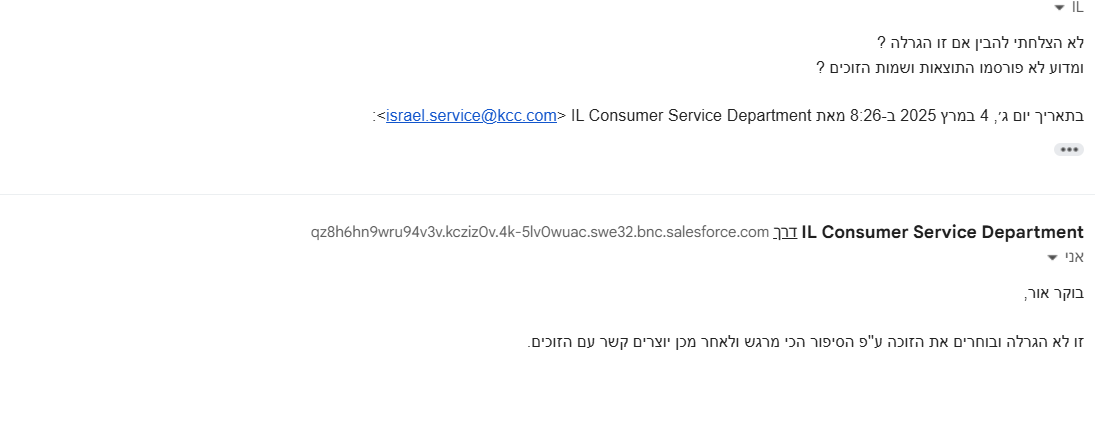 אני מסביר אין הגרלה ולא הייתה הגרלה הם אמרו שזה לא הגרלה אלא הם בוחרים לפי ראות עיניהם משכך הם עקפו לכאורה את חוק ההגרלות הצרכניות שהכללים והפיקוח בו הם ברורים בניגוד למבצע המעורפל הנ"לאני כמעט בטוחה שלפי מה ששמעתי בקו הטלפון של ההגרלה,
