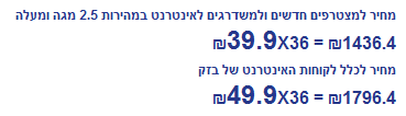 "מחיר לכלל לקוחות האינטרנט של בזק: 49.9 ש"ח* 36 חודש = 1796.4 ש"ח
