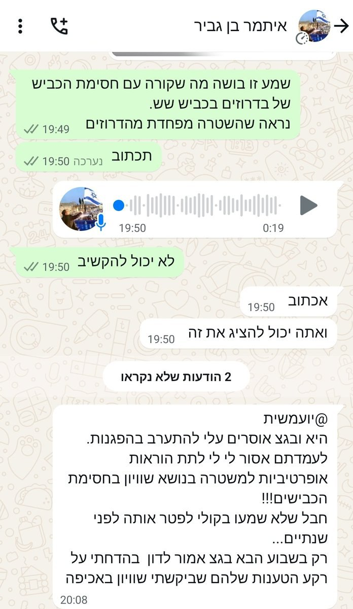 שלחתי לשר לבטחון לאומי הודעה על החרפה בכביש שש, שקומץ דרוזים חוסם שם שעות את הכביש, והמשטרה רועדת מהם ולא מפנה אותם (בניגוד לחרדים שלהם מפוצצים את הראש)