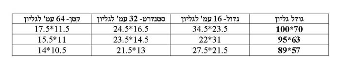 להלן טבלת גדלים לפי גליונות. באדיבות 'נקי כפיים'.