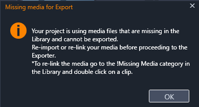 * כדי לקשר מחדש את המדיה עבור אל קטגוריית המדיה החסרה בספריה ולחץ לחיצה כפולה על קליפ