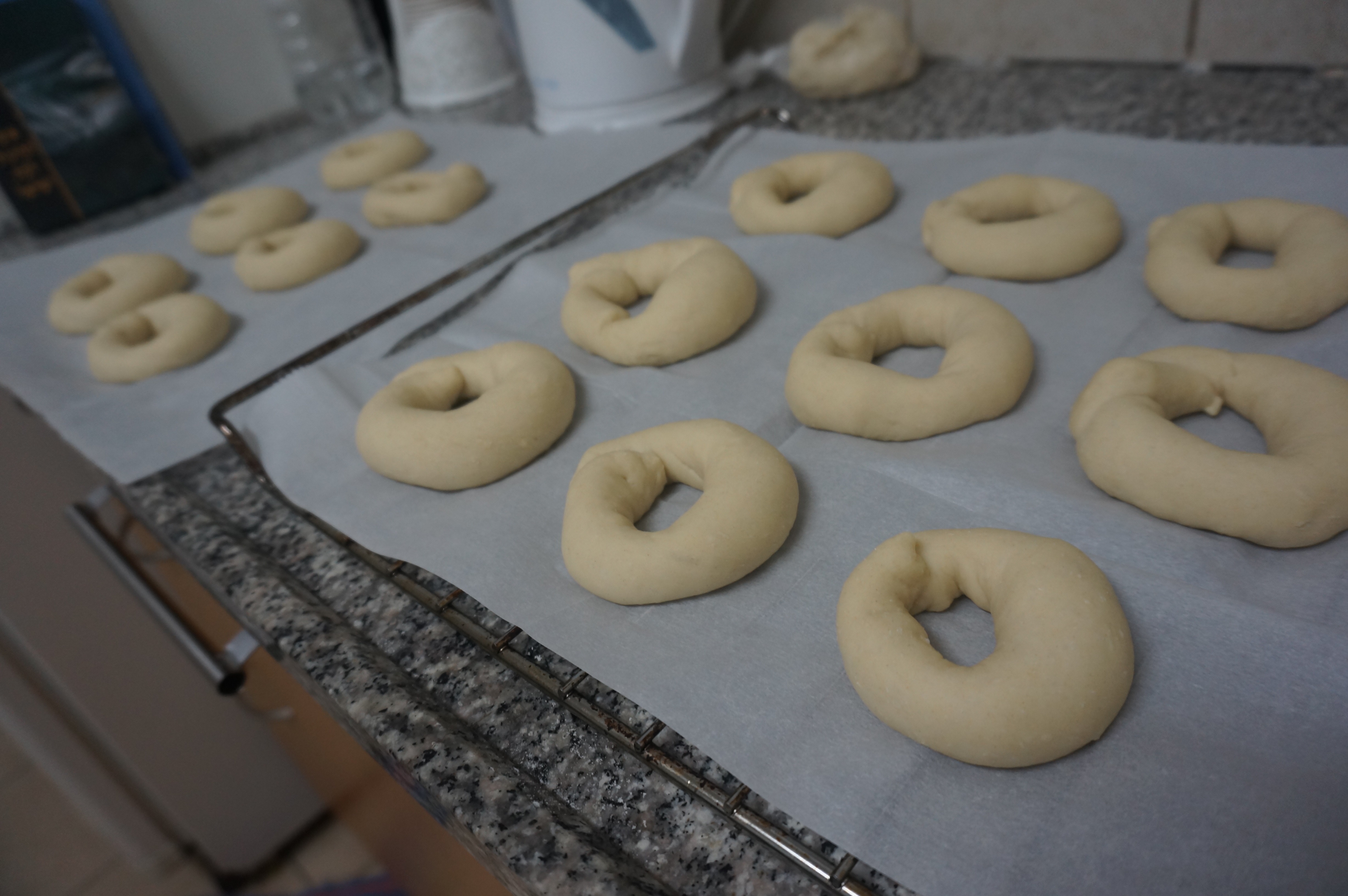 אחרי ההתפחה לשפוך בעדינות מים רותחים (במקום לטבול אותם בסיר מים רותחים) ומאד בעדינות לשפוך את המים מהתבנית (לא נורא אם קצת נשאר) לפזר מלח גס, קצח, שומשום, מה שבא ולאפות בתנור.