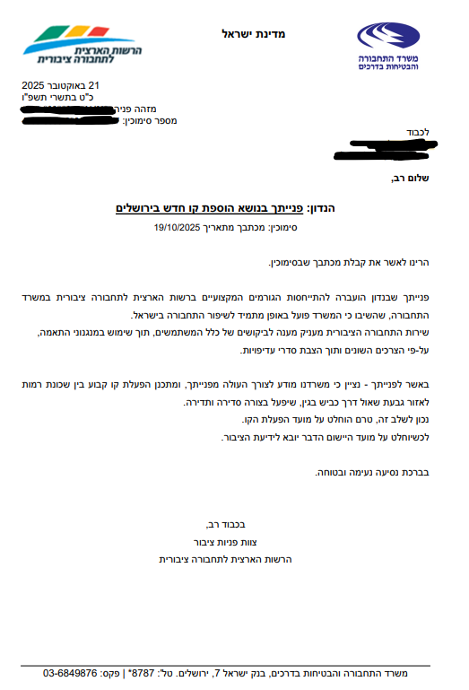 שלחתי פניה למשרד התחבורה וזה מה שקיבלתי