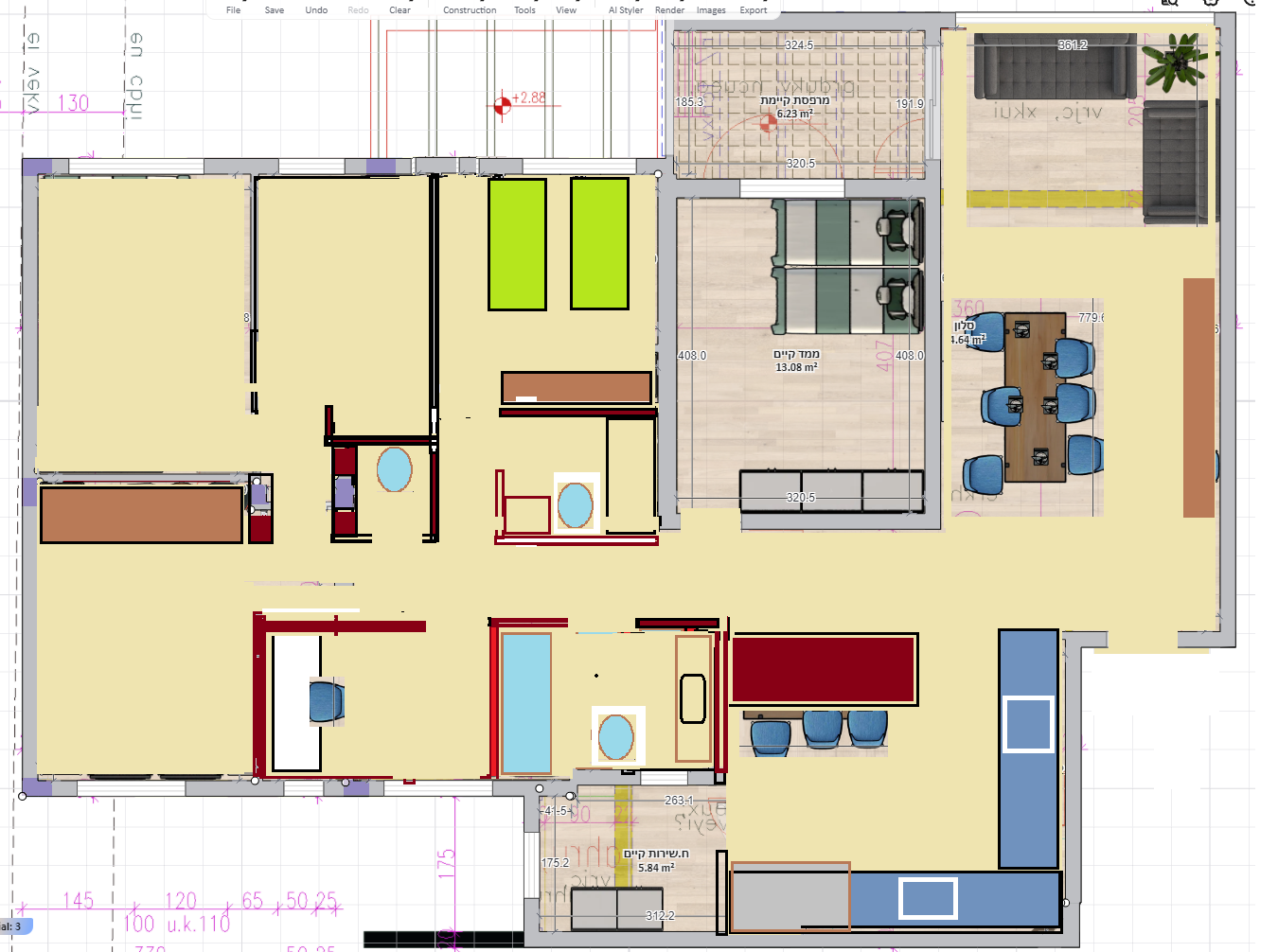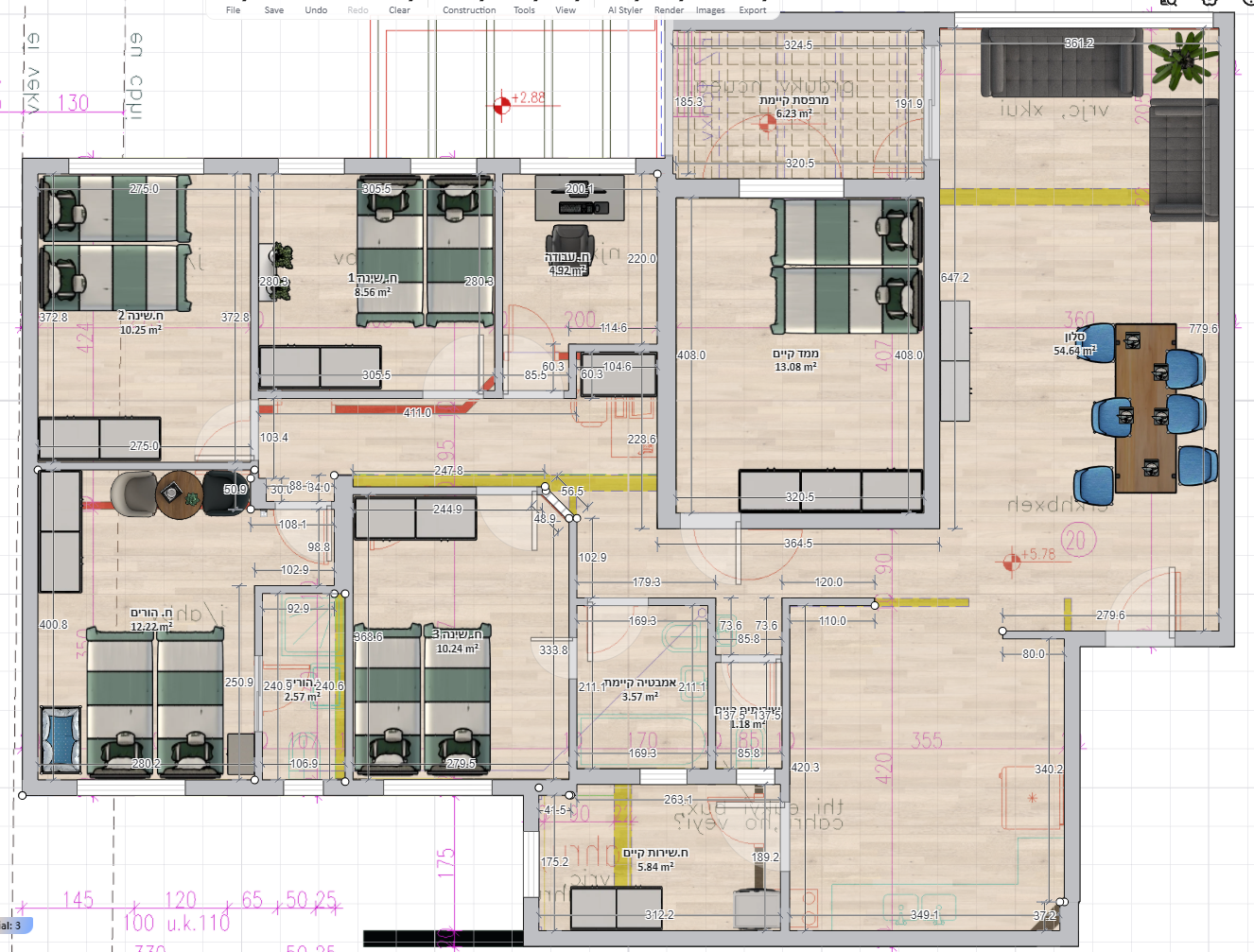 כמו"כ לגבי הריהוט בחדרים אם אתם לא סגורים על הגדלים של הארונות וכו' אולי עדיף להזיז כמה דברים: