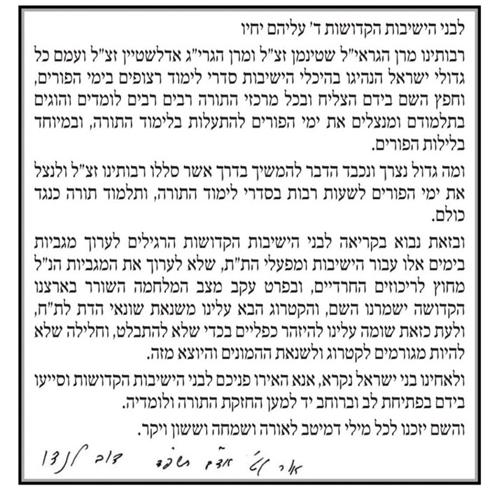 שוב, אנחנו לא משנים סטטוס בין "תורתו אומנותו" לבין "עובד"אולי עדיף שבמקום שבועיים שוטטות ברחובות שהבחורים יעבדו בשבועיים האלו?