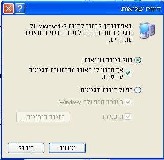 בחלון שנפתח בחר כפתור רדיו ראשון "בטל דווח שגיאות" והסר את הסימון בריבוע טיבת טקסט "אך הודע לי כאשר מתרחשת שגיאה קריטית"