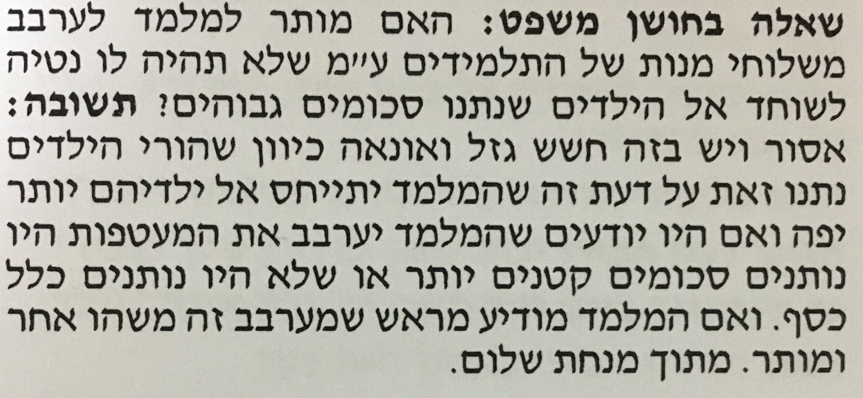 300 ש"ח פעם בשנה בשביל הרבה של הבן שלך זה ממש כלום ביחס לשנת לימודים ולעבודה הקשה והלא מתגמלת שיש היום למלמדים אבל מה לעשות להורים אין יכולת וזה הגיוני. צריך לחשוב באמת איך לעזור למלמדים (לבן שלנו) להרוויח בצורה מכובדת (לפחות כמו המנקה של הכיתה) (וזה תלוי בהורים שיתאגדו מול המנהלים....) וגם באופן כללי אנשים צריכים להבין שיש כספים שצריך להוציא שהם לא מותרות אלא הוצאה סבירה ומנמלית ואם אין להם יכול יחשבו מה לעשות .... כי ד' מינים זה לא מותרות שחייבים משנת יוסף בשביל זה וגם כאן למלמדים זה טיפה חמצן למלמדים שמרוויחים חצי מסכום שמרוויח מורה במדינת ישראל והם לא נכנעים ולא עוברים לממ"ד וממ"ח וכו' ולתת להם טיפה זה לפחות בשביל ההרגשה.