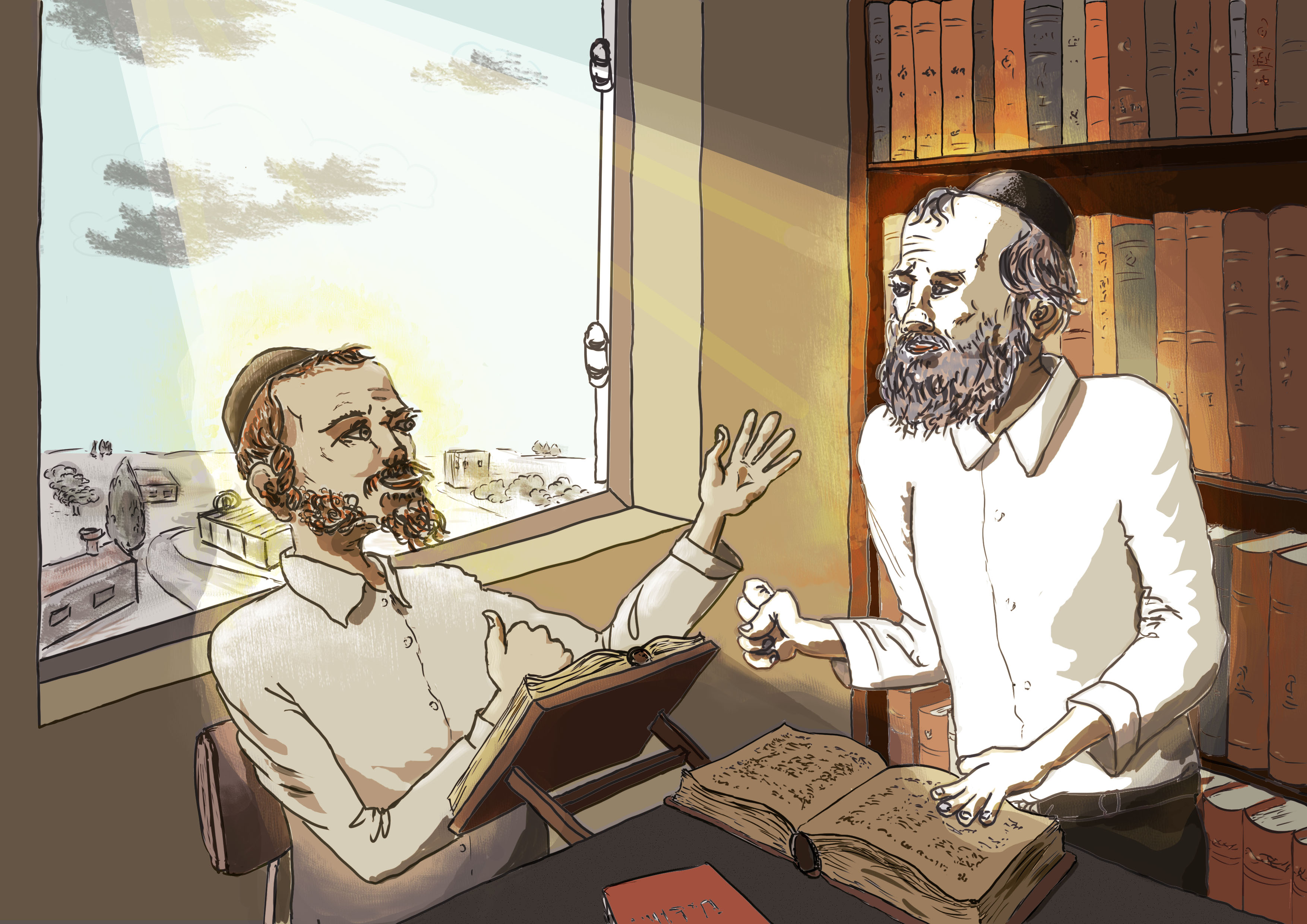 הציור שבחרתי הוא על אברכים שלומדים והאור של העולם שבעצם בו הם מתעסקים, כי לפעמים אנשים ואפילו האברכים עצמם מפספסים את הנקודה הזו, כי יש שלומדים בשביל להצליח ויש בשביל ההנאה של השכל או היצירה, אבל הלימוד הוא בעצם כל האור שיש בעולם, כי הוא הרצון שמחיה את הכל, רצונו של ה', ובדרך כלל מרגישים אותו רק אחרי הלימוד איך שהוא משפיע על האדם, רציתי להמחיש איך בשעת הלימוד הוא אופף את האדם, ואפילו שנראה שהוא במקום אפל עם ספרים ישנים ולא מתקדם, בעצם כל האור של הבריאה הוא איתו,
