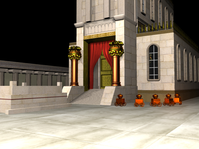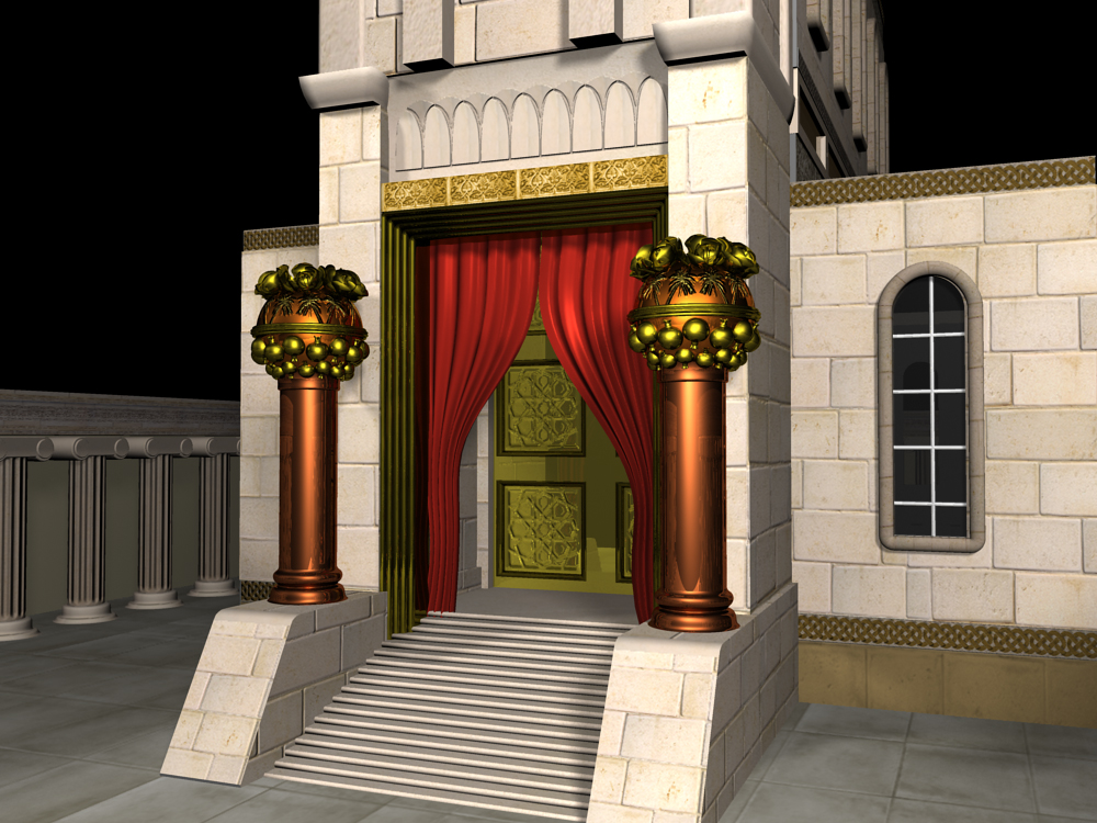 לגבי הראשון - הוא עדיין לא מוּדַל, והעבודה מסובכת הרבה יותר ממה שזה נראה. אפילו העמודים החלקים המופיעים במודל המדהים הזה אינם נכונים כי היו עליהם צורות של רימונים ושושנים וכו'.