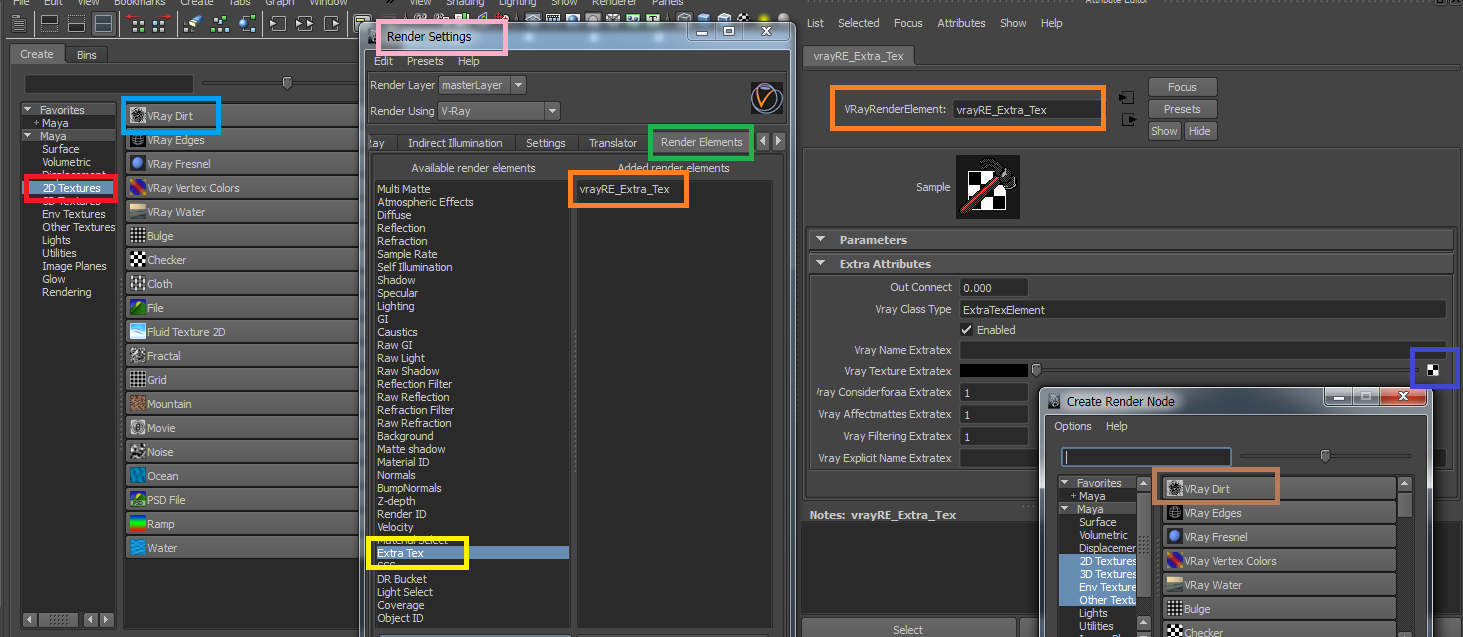 בדרך כלל משתמשים בה כאלמנט שנמצא בחלון שבמסגרת הורודה, בטאב שבמסגרת הירוקה, בוחרים במסגרת הצהובה, במסגרת הכתומה יש אפשרות להביא טקסטורה ע"י הפעלת המסגרת הכחולה, ה - vray Dirt מוקף במסגרת חומה.