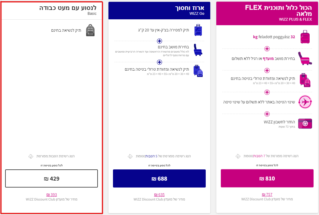 ואחרי זה בהמשך יש אפשרות לבחור במזוודה או להישאר ללא מזוודה