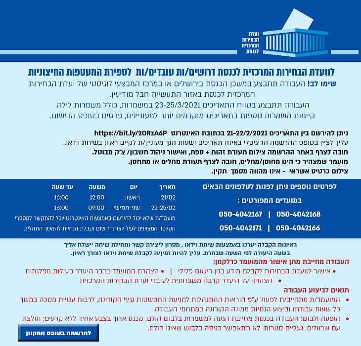 בשעות האחרונות מופץ קישור שמציע עבודה ב"פניות הציבור" בבחירות בשכר גבוה, שימו לב כי האתר אינו של ועדת הבחירות, וככל הנראה מדובר בנסיון לאסוף פרטים, ולא בהצעה אמיתית.