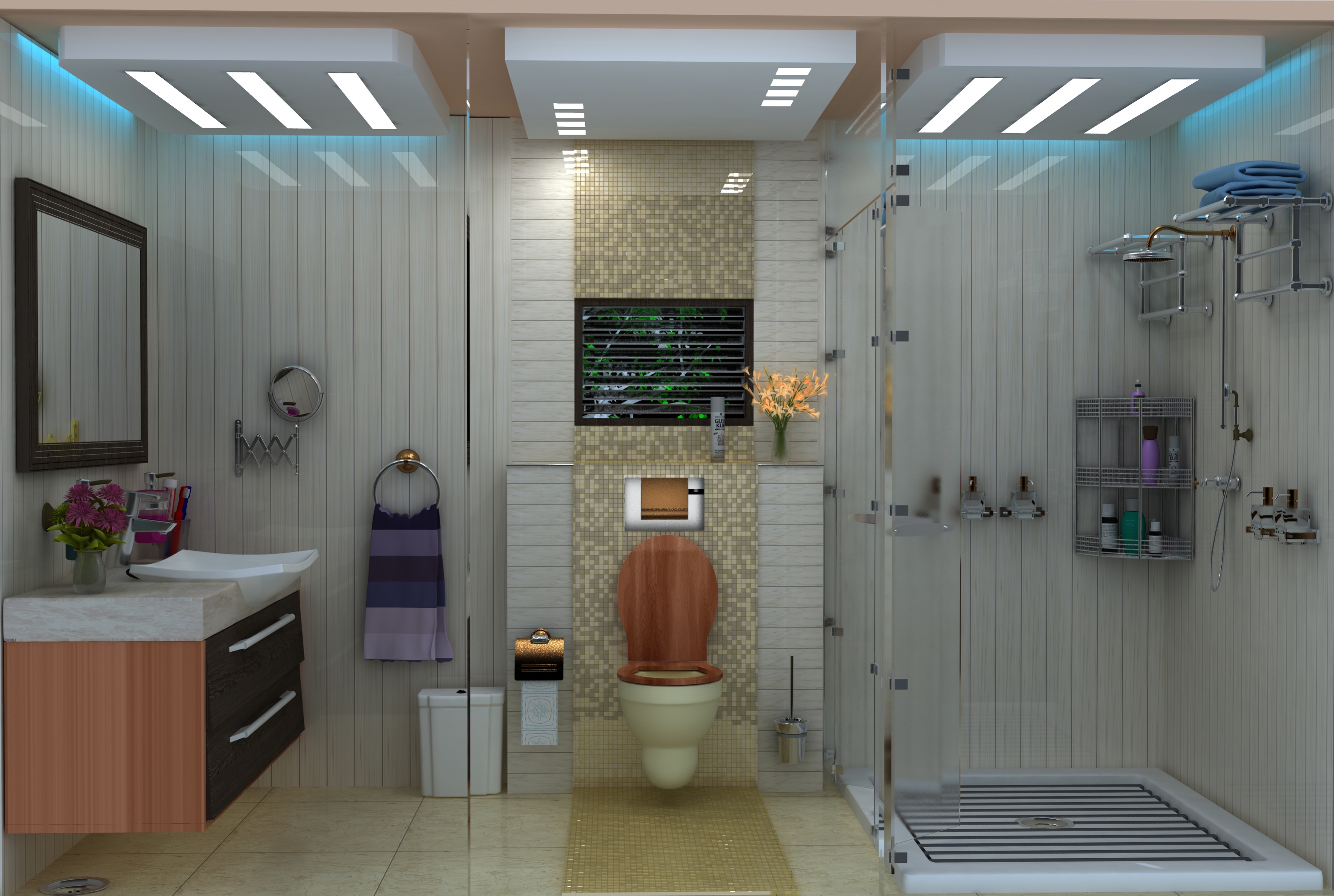 קירות הזכוכית שבתמונה (לבד מאלו של המקלחון) הינם רק לצורך ההדמיה של החלל כולו ובמציאות הינם קירות לכל דבר .