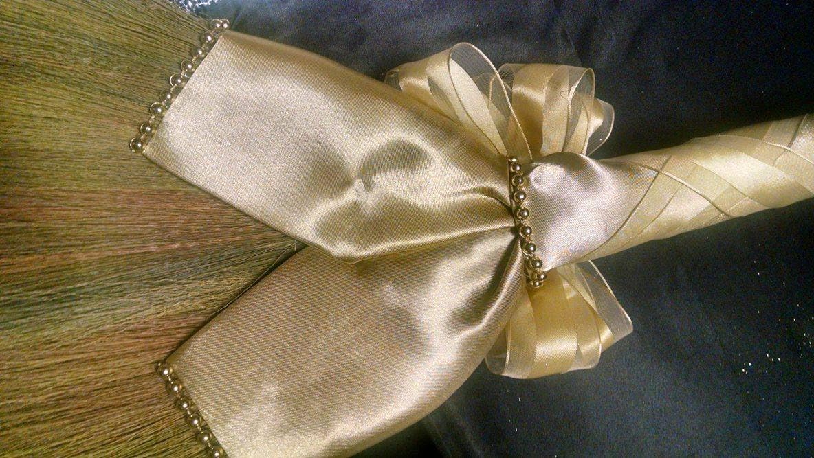 תקני סרט סטן מבריק בהיר- שמנת/ זהב ותלפפי סביב המקל, את השערות למטה את יכולה לצהוע עם ספריי מוזהב למשל, ויפה לקשור פפיון גדול על החיבור של המטאטא למקל