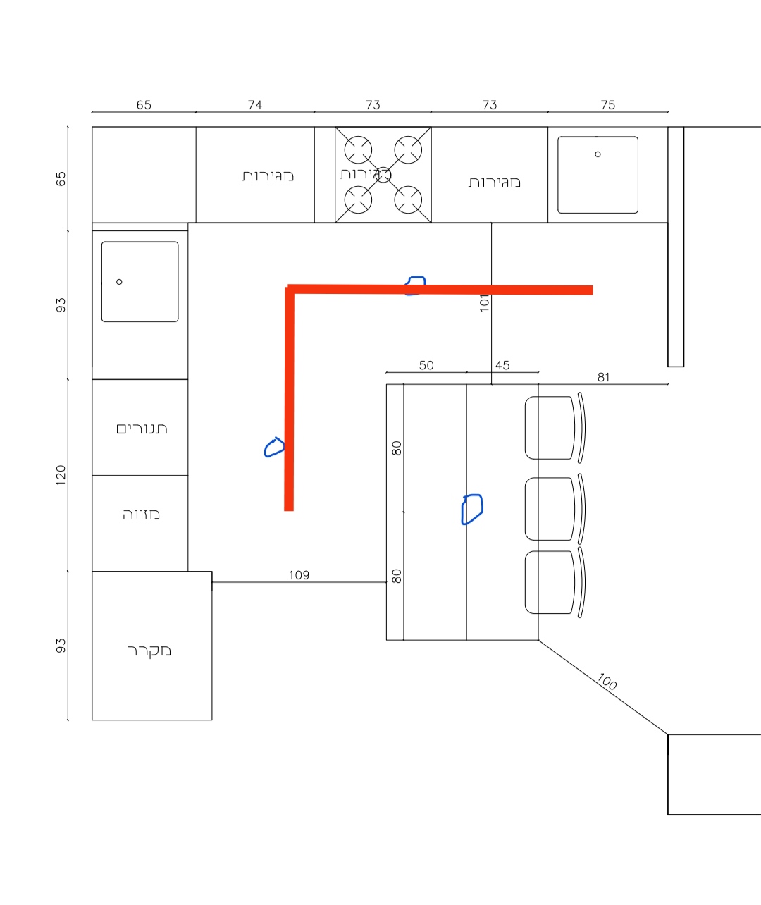 א. איפה הכי כדאי למקם את התאורה למטבח, מצרף שרטוט של המטבח והמקומות שחשבתי. (שתי תאורות מרכזיות, ועוד אחת תלויה מעל האי)