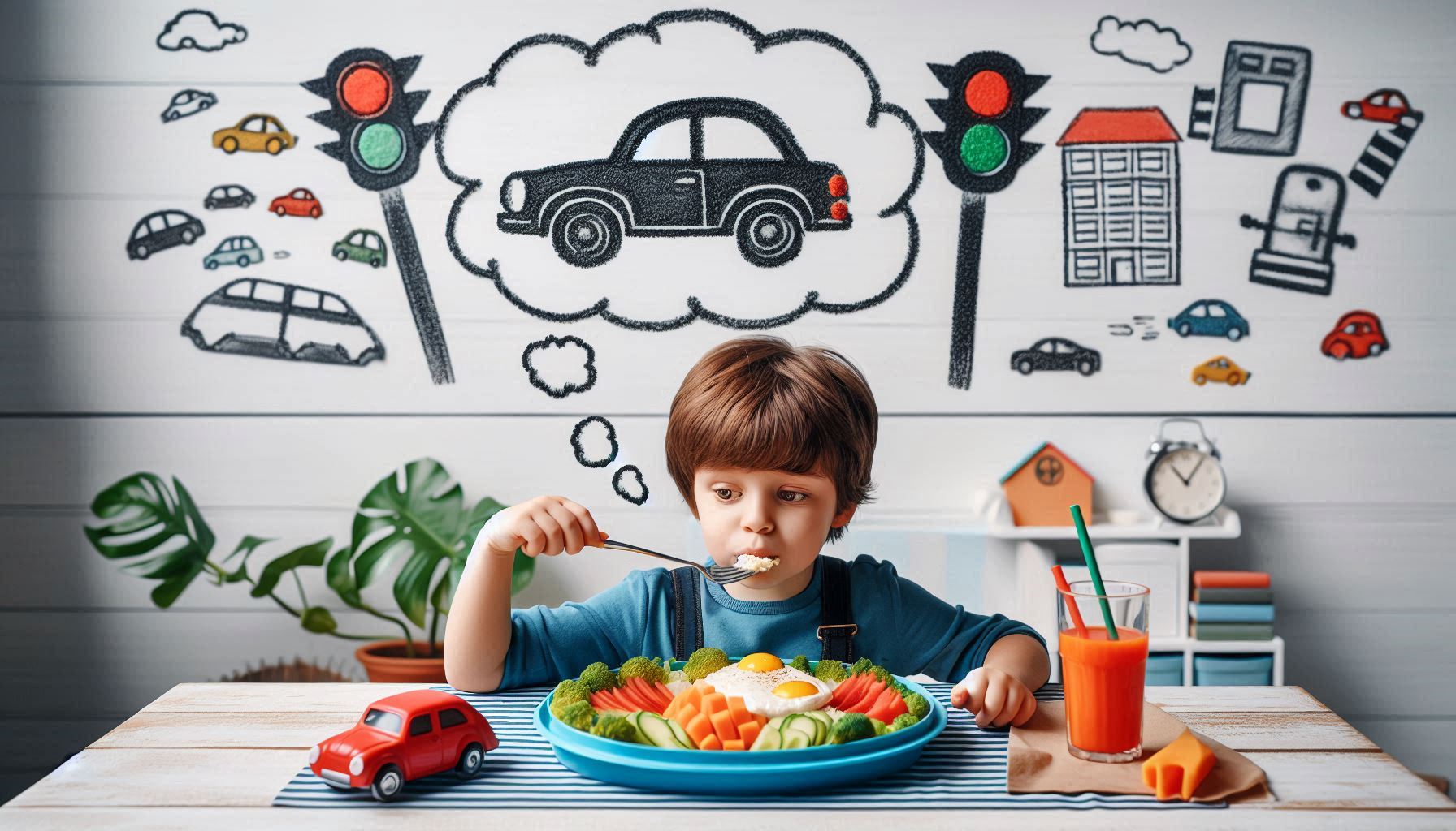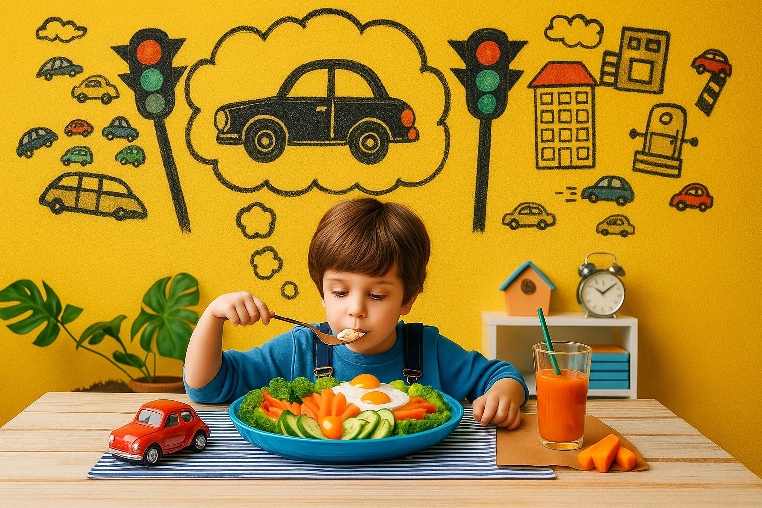 • ילד יושב ליד שולחן ערוך ואוכל ארוחה בריאה מתוך צלחת אוכל מחולקת בצורת מכונית וחולם על מכוניות...jpeg